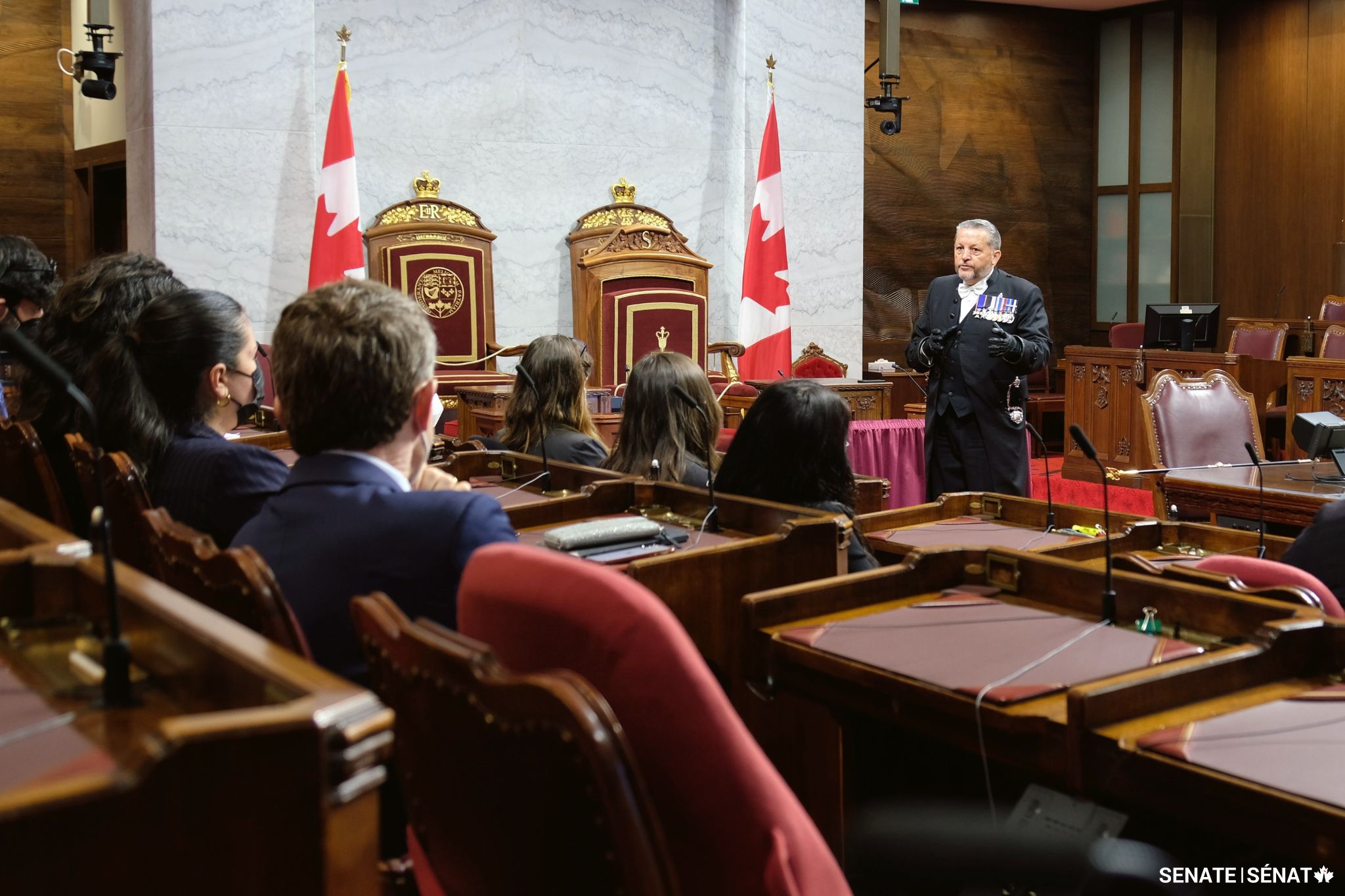 Wednesday, June 8, 2022 – The Usher of the Black Rod hosts 12 interns from the British Columbia Legislative Internship Program in the Senate Chamber. This meeting, coordinated by SENgage, was part of their study tour in Ottawa to learn about the parliamentary system.