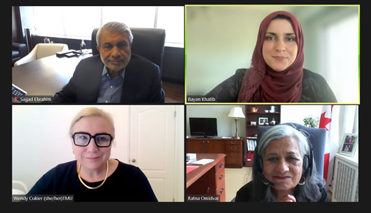 Monday, June 13, 2022 – Senator Ratna Omidvar participates in a virtual panel discussion on supporting refugee resettlement, hosted by Toronto Metropolitan University. The other panellists were Sajjad Ebrahim of Sajjadiyya Trust, Bayan Khatib of The Northpine Foundation and Wendy Cukier, founder of the Diversity Institute at Toronto Metropolitan University.
