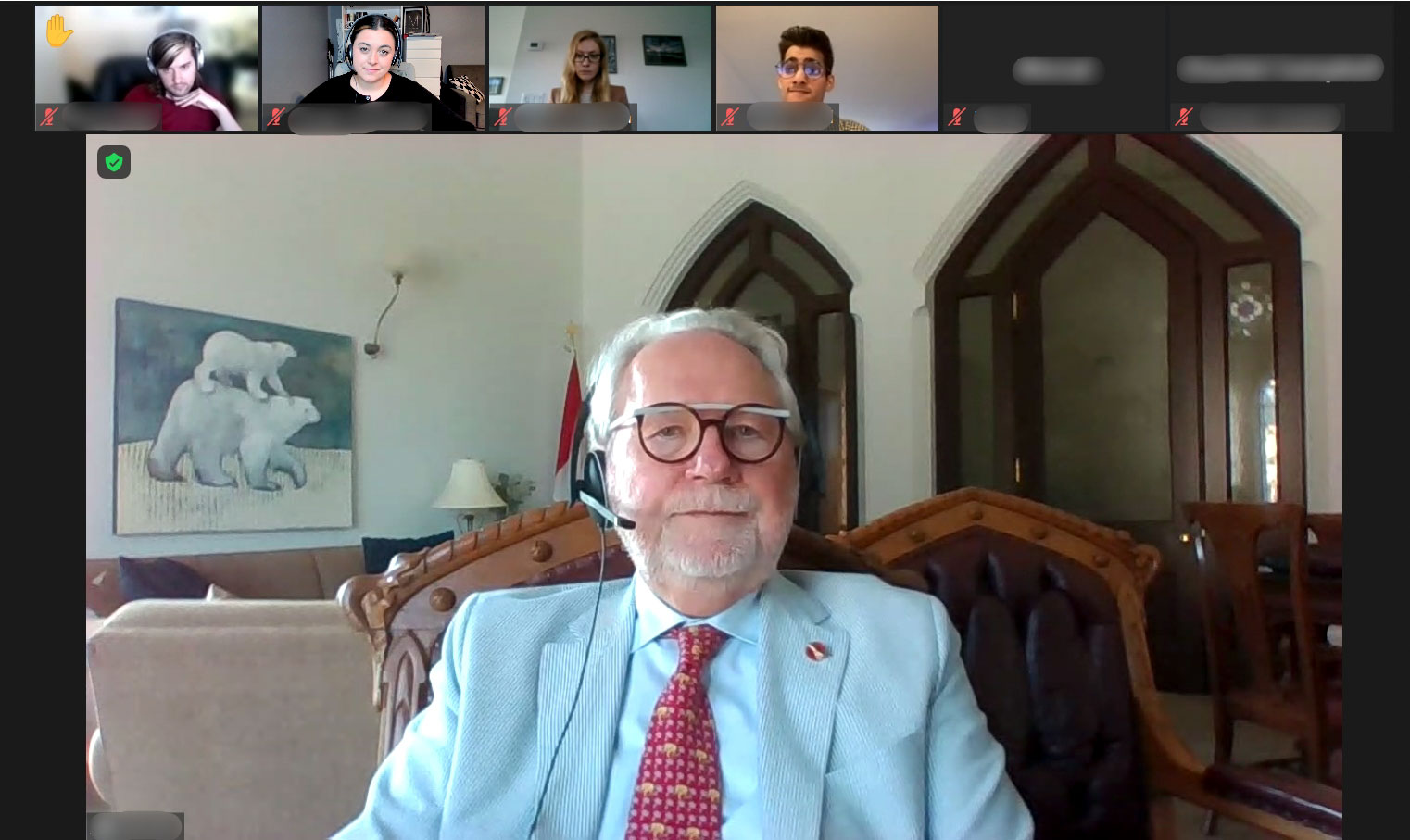 Monday, June 20, 2022 – Senator Peter Harder talks about global affairs and international law with students enrolled in an international politics course at the University of British Columbia’s Okanagan campus. Organized by SENgage, the event gave students the opportunity to ask the senator questions about his work.