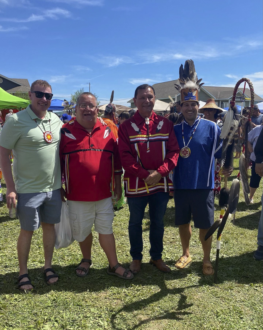 Saturday, August 6, 2022 – Senator Brian Francis (second from the right) celebrates the 30th anniversary of the Listuguj Pow Wow, with the Mi’gmaq Community of the Listuguj First Nation (Quebec). Senator Francis is pictured with MP Jaime Battiste (left), Councillor Wendell Metallic (second on the left) and Chief Darcy Gray (right).