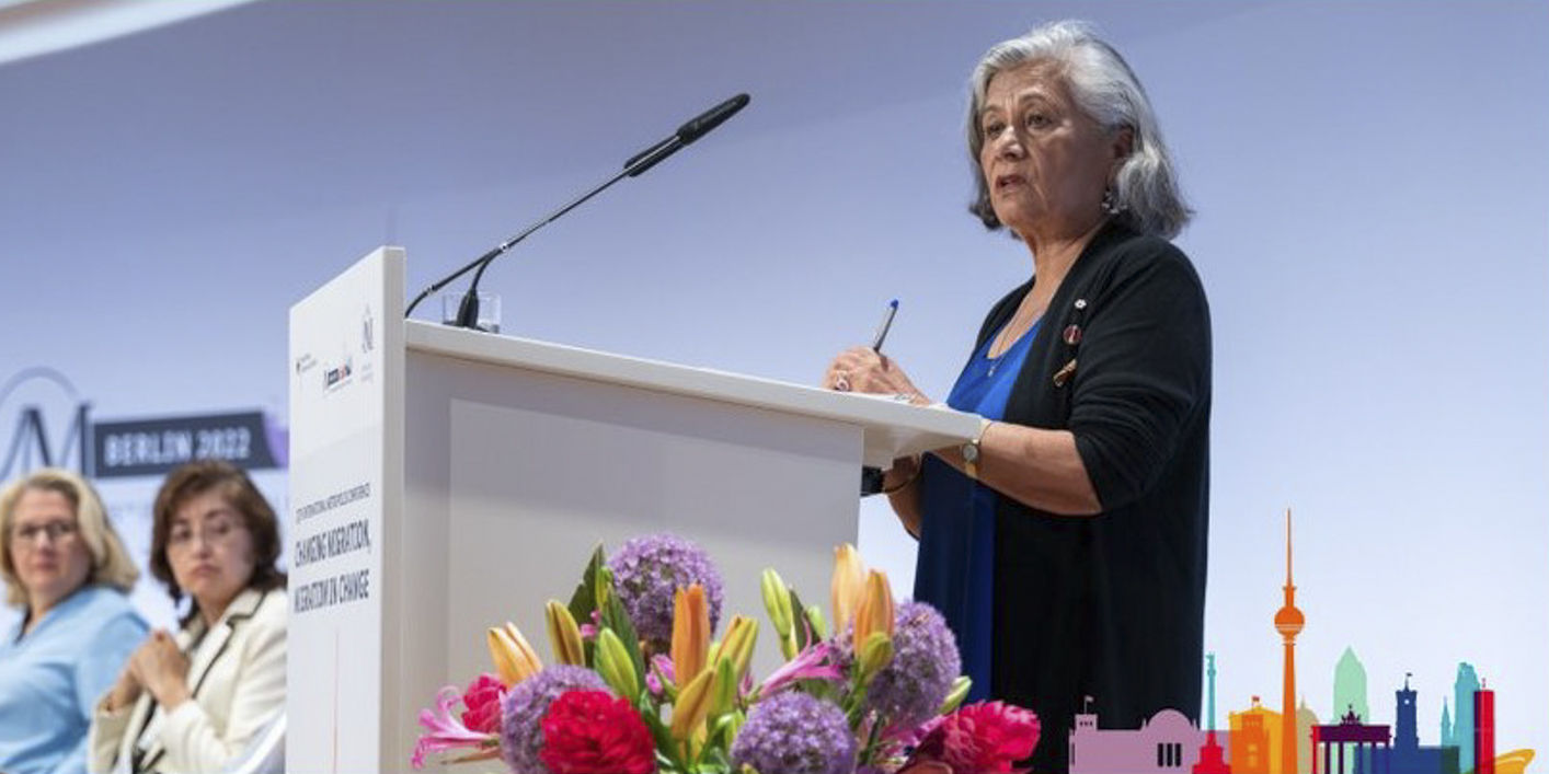 Friday, September 9, 2022 – Senator Ratna Omidvar speaks at the 25th International Metropolis Conference’s closing plenary on the future of migration in Berlin, Germany, with Svenja Schulze, German Federal Minister for Economic Cooperation and Development (far left), and Silvia Espíndola, Ecuador’s Vice Minister for Human Mobility.