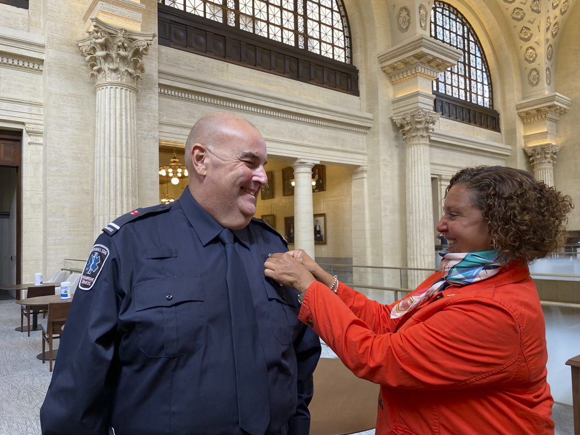 Tuesday, September 6, 2022 – Senator Bernadette Clement presents paramedic Scott Halliday with his Exemplary Service Medal for 20 years of meritorious service. She also gave him a tour of the Senate of Canada Building while discussing the role of the Senate and the importance of paramedicine.