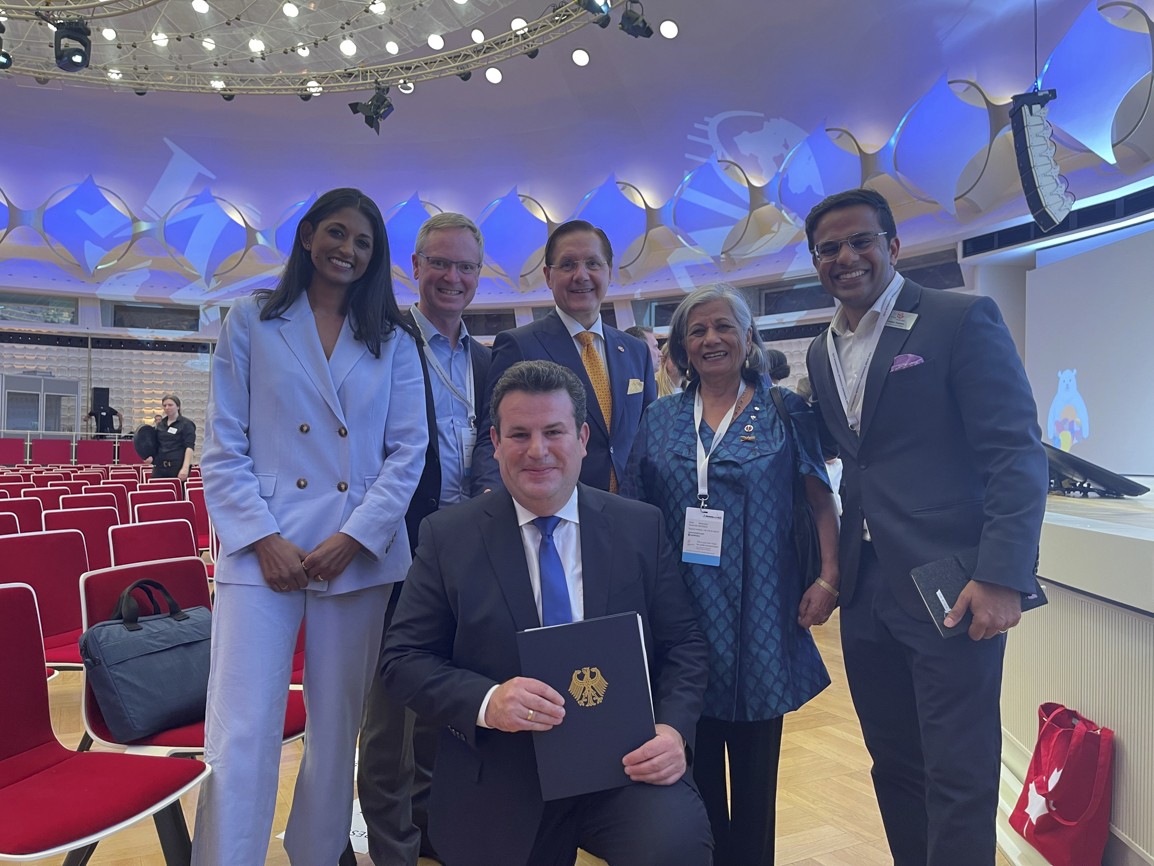 Tuesday, September 6, 2022 – Senator Ratna Omidvar (second from the right) and Senator Tony Loffreda (back centre) attend the 25th International Metropolis Conference in Berlin, Germany, on immigration policy. Also pictured are keynote speaker Hubertus Heil, Germany’s Federal Minister of Labour and Social Affairs (kneeling); Sumi Somaskanda, an anchor with DW News; Christopher May, director of public affairs and communications at the College of Immigration and Citizenship Consultants; and Hyder Hassan, CEO of Immigrant Services Calgary.
