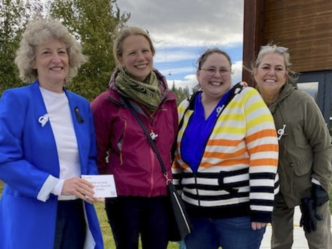 Thursday, September 8, 2022 – For International FASD Day on September 9, Senator Pat Duncan (left) attended a Fetal Alcohol Spectrum Society Yukon lunch at the Kwanlin Dün Cultural Centre in Whitehorse, Yukon. The event included FASD information kiosks courtesy of the Yukon Liquor Corporation. Senator Duncan, who has fostered public awareness about the disorder for many years, posed with members of the Yukon Interagency Committee during these events, holding a token of little red running shoes provided by CanFASD.