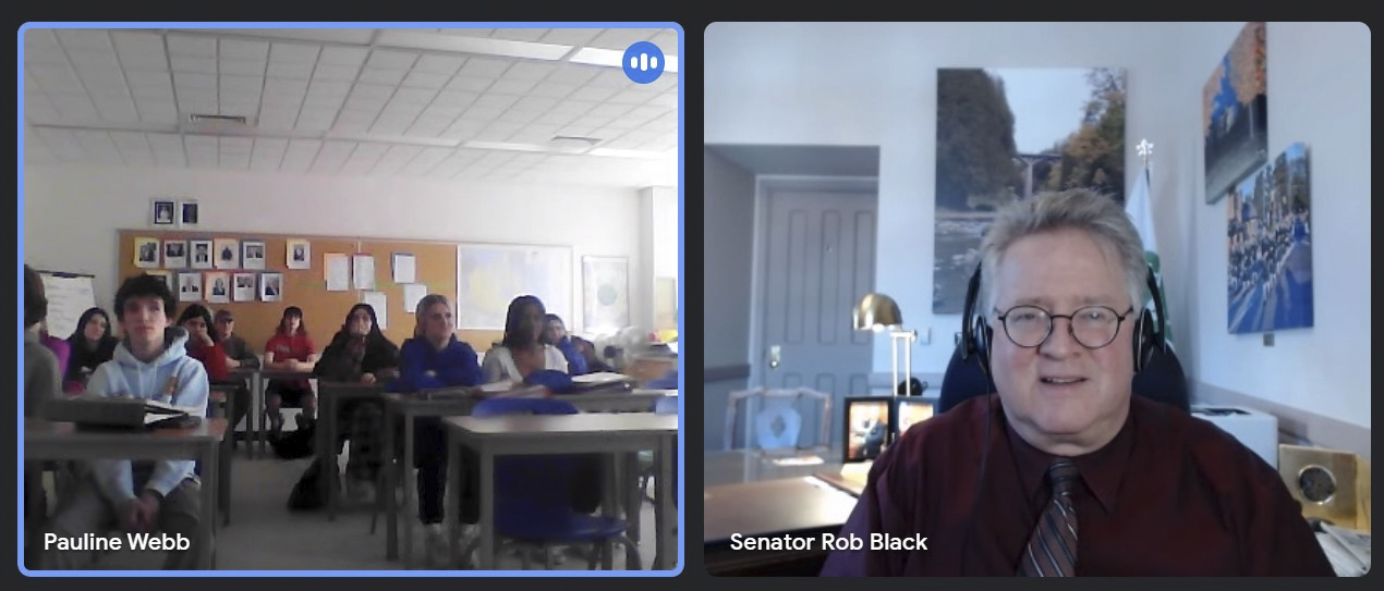 Monday, March 6, 2023 – Senator Rob Black virtually attends Mrs. Webb’s Grade 10 civics class at Huntsville High School in Huntsville, Ontario, to discuss the work of the Senate and his role as a senator.