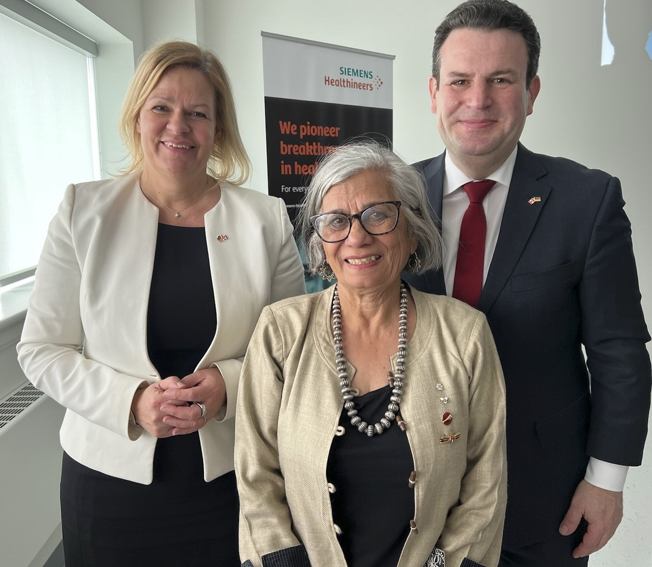 Monday, March 20, 2023 – Senator Ratna Omidvar, centre, meets with German Minister of the Interior and Community Nancy Faeser, left, and German Minister of Labour and Social Affairs Hubertus Heil, right, during a visit to Siemens Healthineers in Ottawa, Ontario. The three parliamentarians looked at immigrant employment practices the company has successfully implemented.
