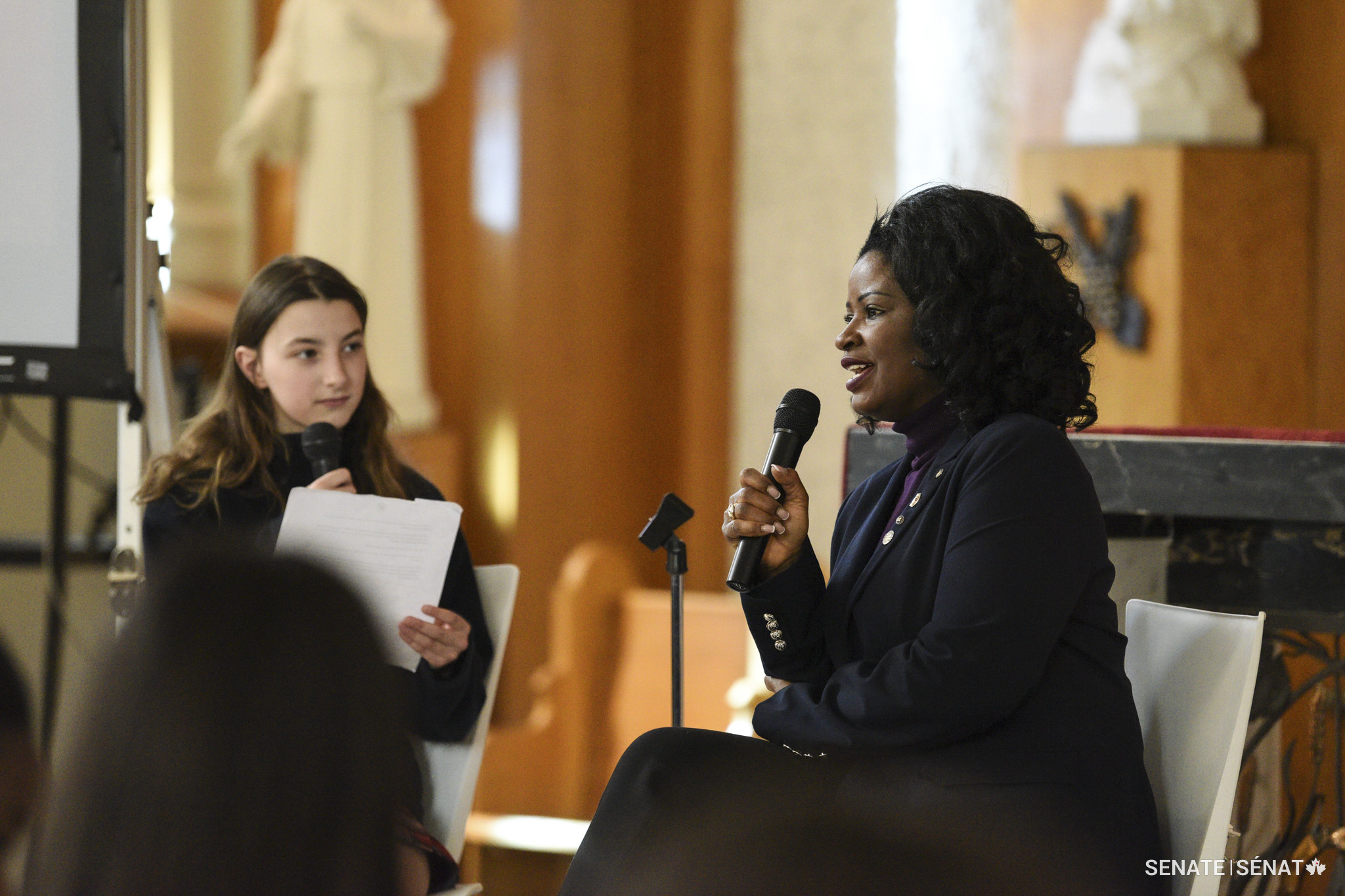 Monday, March 20, 2023 – Senator Amina Gerba participates in a fireside chat with a budding student journalist at Collège Saint-Joseph de Hull in Gatineau, Quebec. During the event coordinated by SENgage, the senator spoke about her role in Canada’s Upper Chamber and encouraged the 300 students in the audience to believe in themselves, follow their passions and push themselves outside their comfort zones.