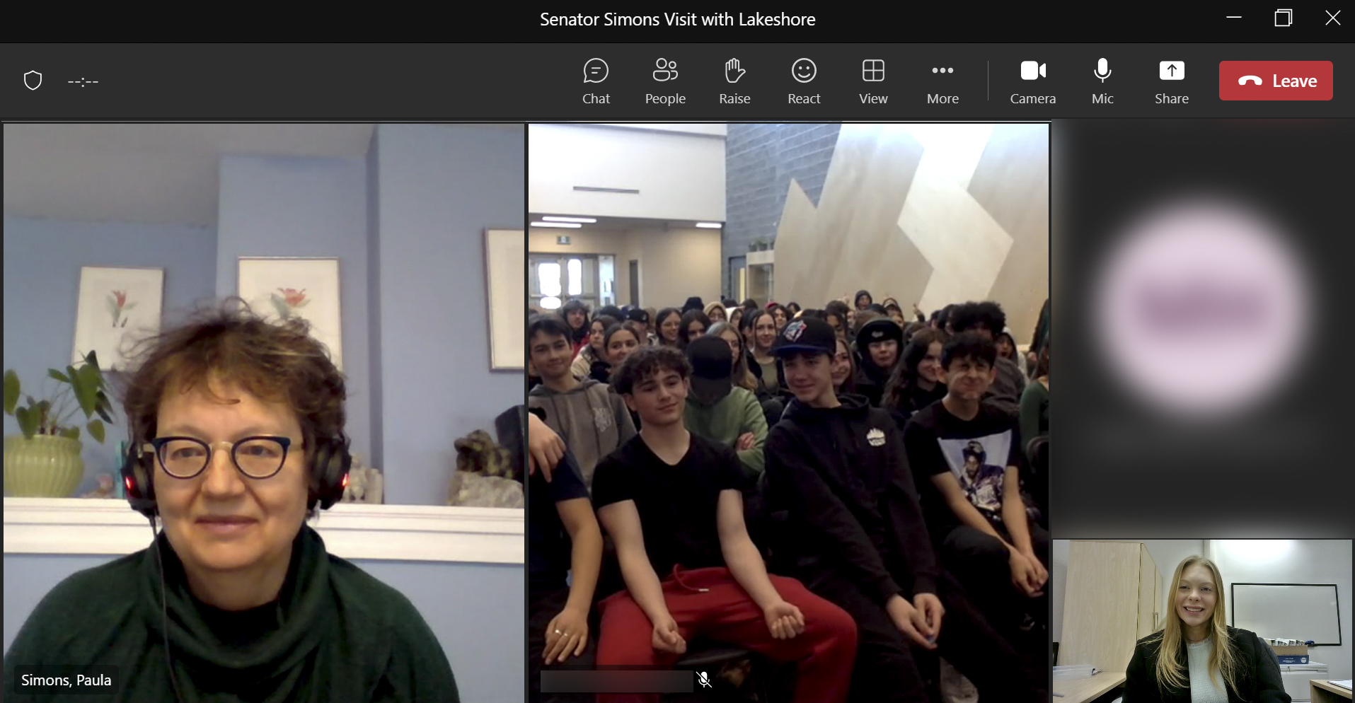 Friday, March 17, 2023 – Senator Paula Simons meets virtually with students at Lakeshore School in Calgary, Alberta. As part of the visit organized by SENgage, she talked about her path to the Red Chamber and her work as a senator and participated in a question-and-answer period.