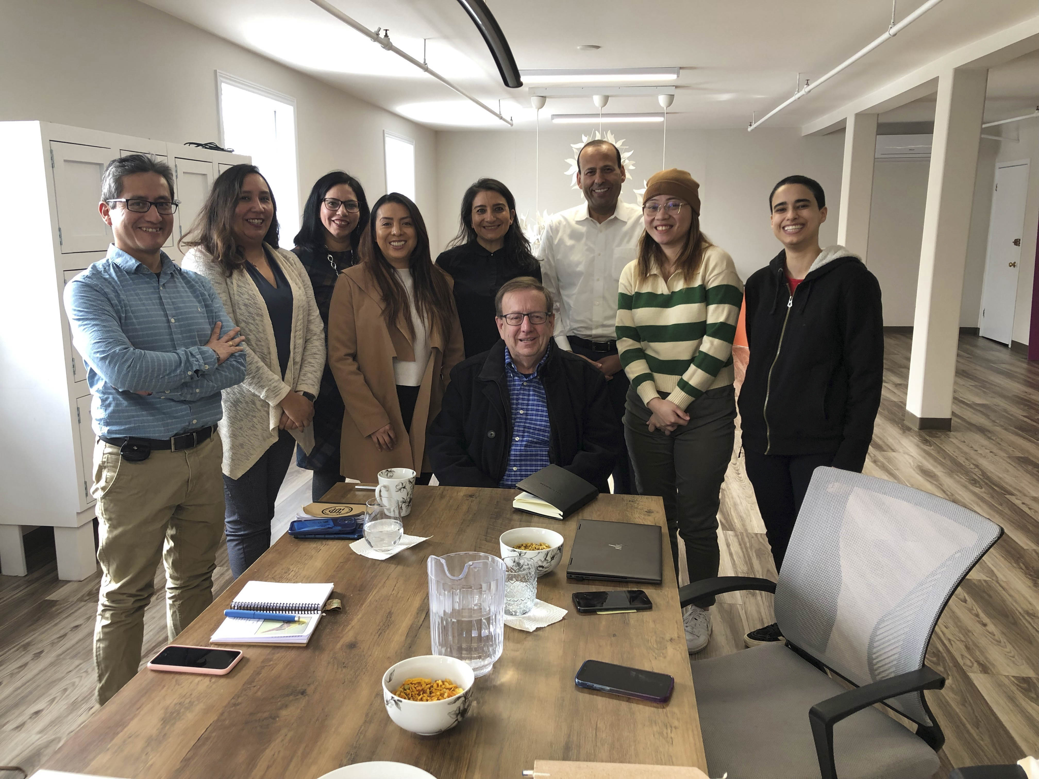 Tuesday March 14, 2023 – Senator Percy E. Downe, sitting, visits the NuWelCom office in Charlottetown, Prince Edward Island. The company runs a made-in-Atlantic Canada app that helps new immigrants better integrate and participate in their community. Senator Downe met with co-CEO Khalid Shami, third from right, and with new immigrants from Peru, Colombia and Ecuador, who now live on Prince Edward Island.