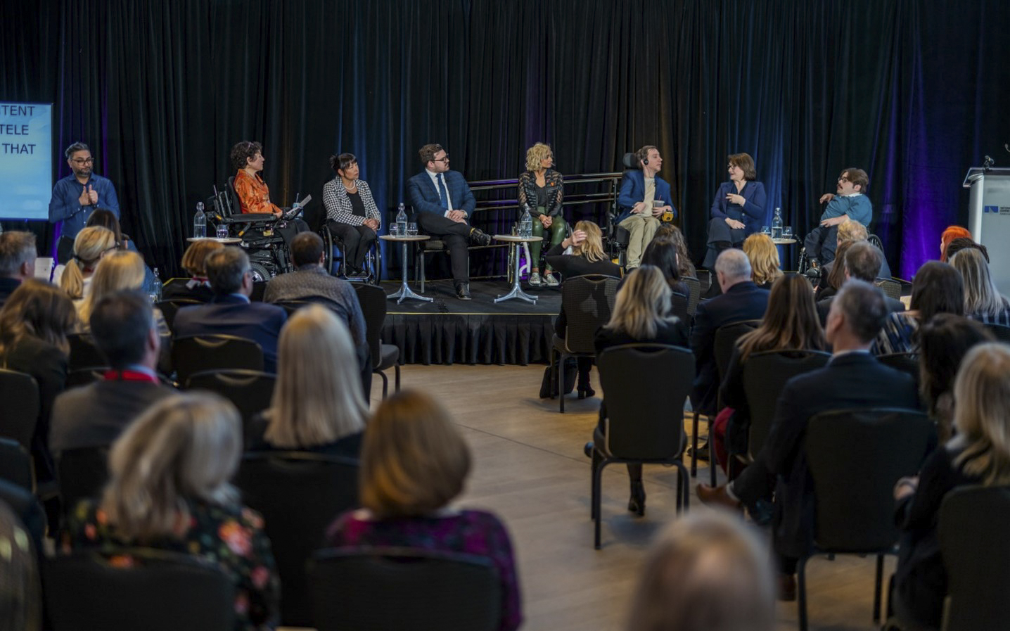 Wednesday, March 22, 2023 – Senator Chantal Petitclerc, third left, participates in a panel discussion on the role of accessibility in the media during an event celebrating accessibility, hosted at the National Arts Centre in Ottawa, Ontario. The panellists included: Yazmine Laroche, president of the Disability Screen Office; Senator Petitclerc; Jérôme Bergeron, CBC journalist and news anchor; Benveet (Bean) Gill, star and consulting producer of television series Push; Sean Towgood, author and creator of TV comedy series You’re My Hero; Isabella Federigi, vice-president of content development and programming at AMI-télé; and Kéven Breton, CBC sports journalist and host of Ça me regarde.