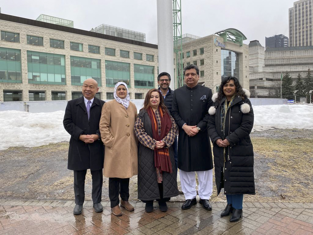 Thursday, March 23, 2023 – Senator Salma Ataullahjan celebrates Pakistan Day at Ottawa City Hall by raising the country’s flag with fellow Pakistani-Canadians. Pictured from left: member of Parliament (MP) for Markham—Unionville Paul Chiang, Scarborough Centre MP Salma Zahid, Senator Ataullahjan, Ottawa Centre MP Yasir Naqvi, High Commissioner for Pakistan to Canada Zaheer Janjua; and Mississauga—Erin Mills MP Iqra Khalid.