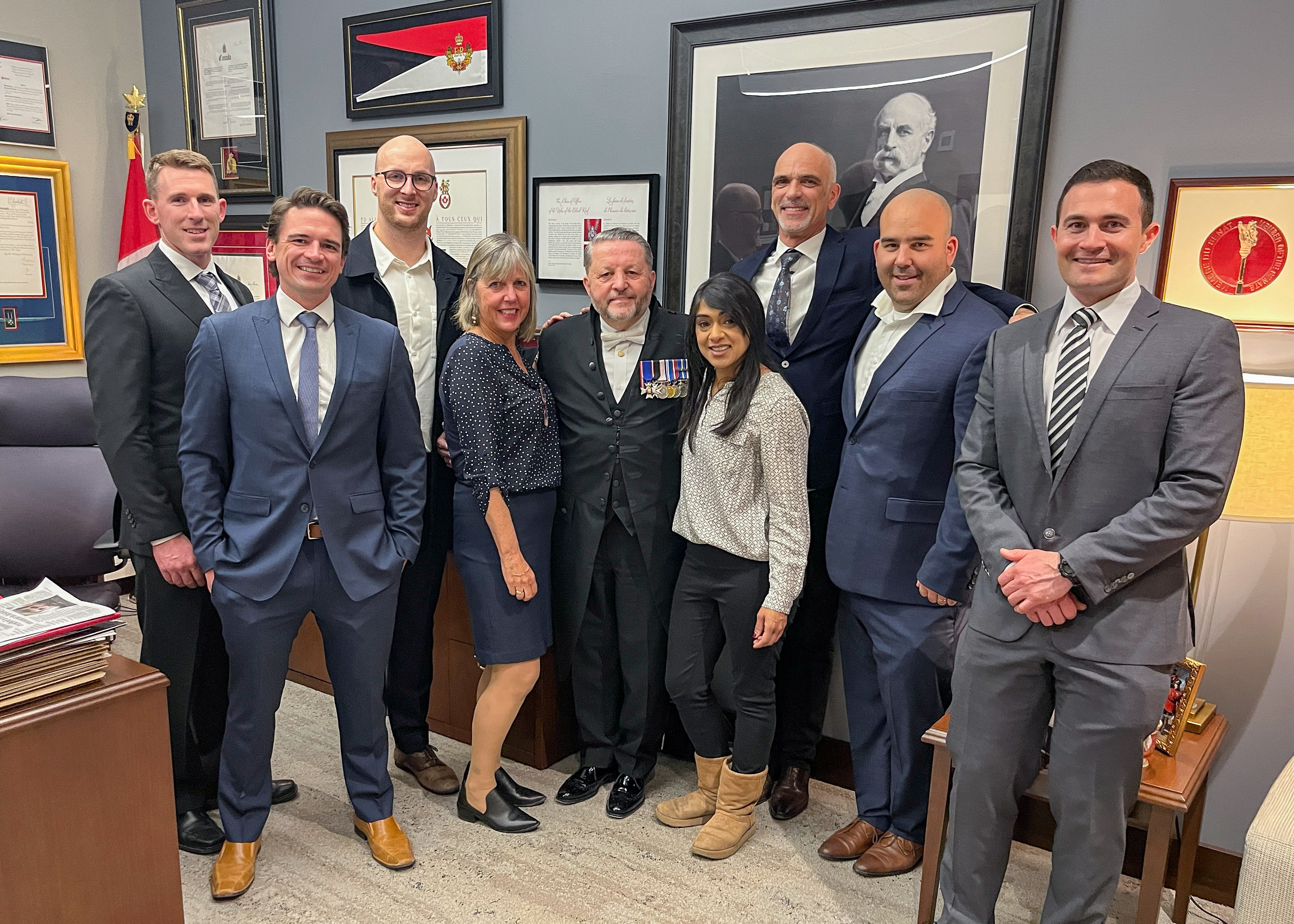 Tuesday, March 28, 2023 – Senator Marty Deacon, fourth from left, meets with Ontario members (Cambridge, Waterloo and Kitchener) of the International Association of Fire Fighters to discuss Bill C-224, the National Framework on Cancers Linked to Firefighting Act. The firefighters visited the Senate of Canada Building in Ottawa, Ontario, with Senator Deacon and member of Parliament for Waterloo, Bardish Chagger, fourth from right. They also met with the Usher of the Black Rod, J. Greg Peters, centre, and learned about the Senate’s history and the traditions behind the Black Rod.