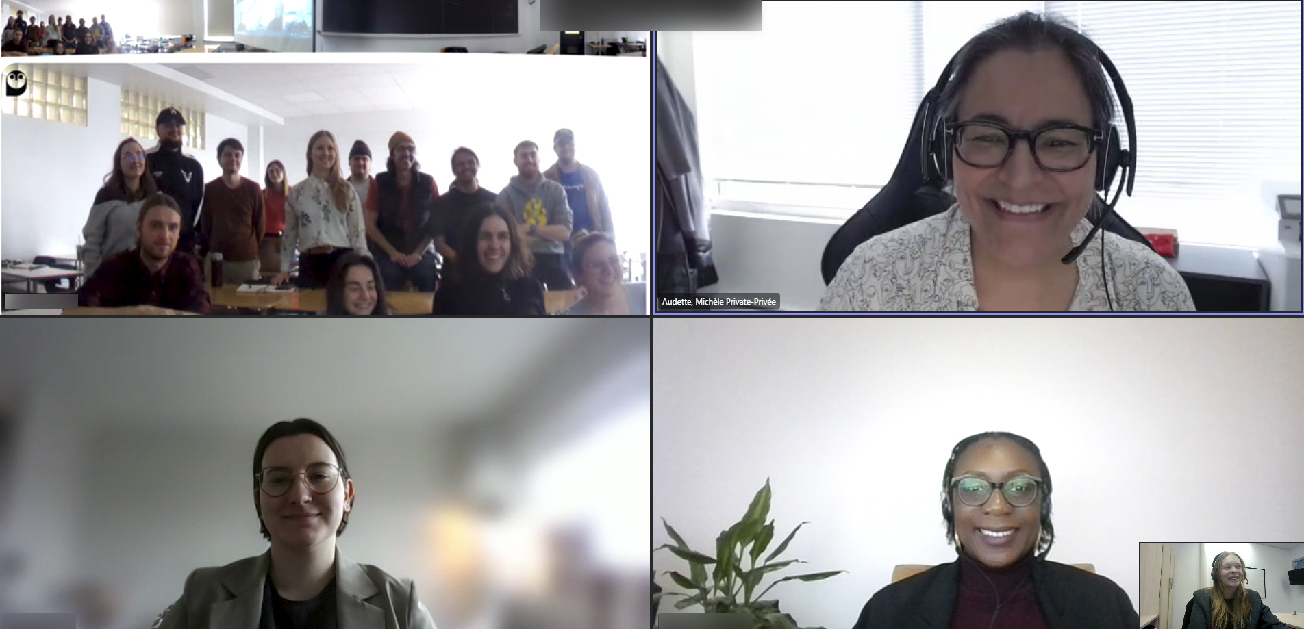 Friday, March 31, 2023 – Senator Michèle Audette meets with undergraduate students at the University of Sherbrooke. In this virtual meeting organized by SENgage, she described her journey to the Senate. She also facilitated a discussion and question period on the relationship between governments and Indigenous peoples, and reconciliation.