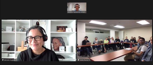 Wednesday, March 15, 2023 – Senator Michèle Audette visits Dr. Jodey Nurse’s class at the McGill Institute for the Study of Canada. In this session organized by SENgage, the senator spoke about her path to the Senate and her work in the Upper Chamber as part of the class’s study on Indigenous governance.