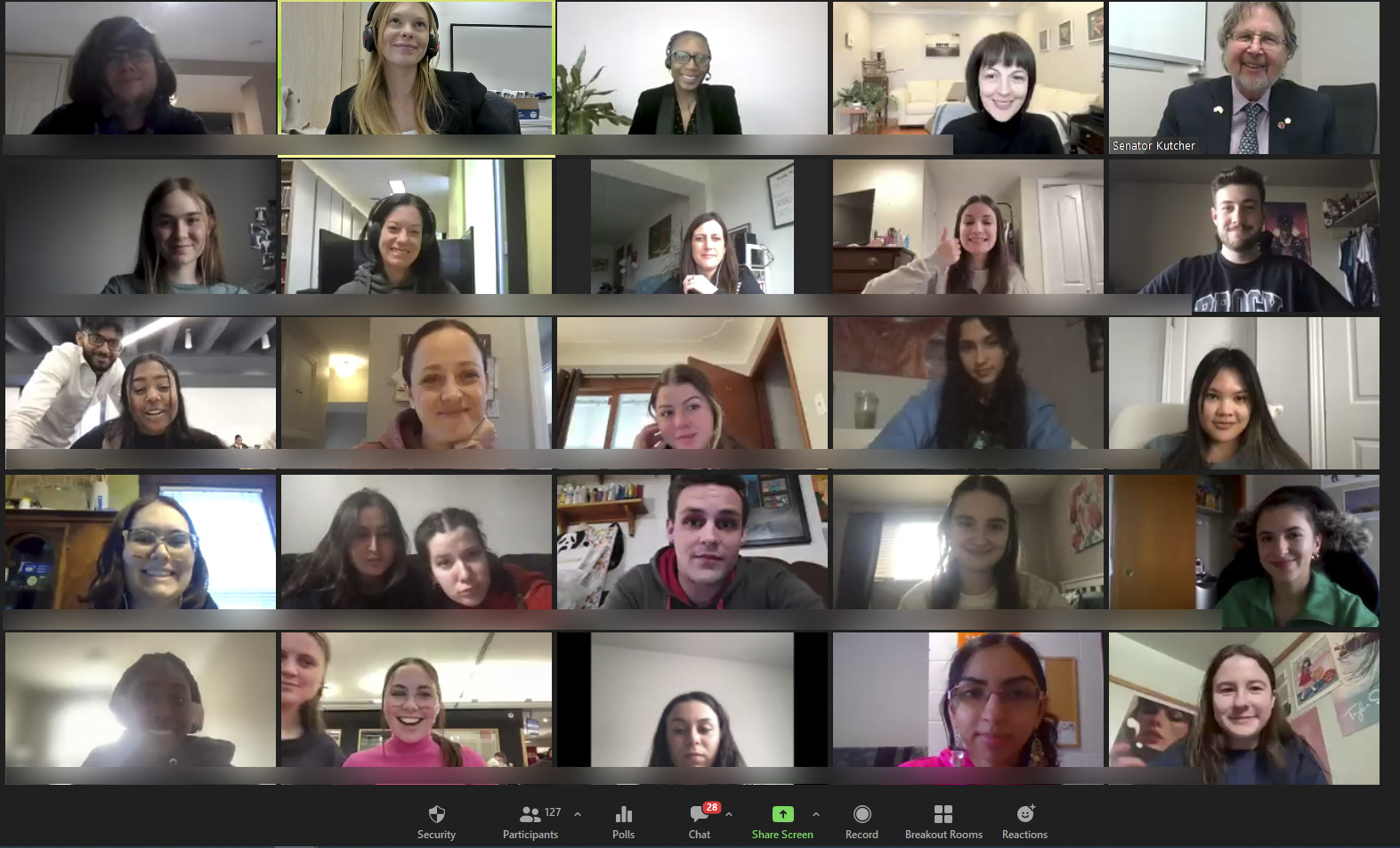 Thursday, March 30, 2023 – Senator Stan Kutcher speaks to students from Dr. Heather Ramey’s community engagement course at Brock University. As part of this virtual session coordinated by SENgage, he spoke about the work he is currently doing in the Senate and the importance of engaging with community organizations.
