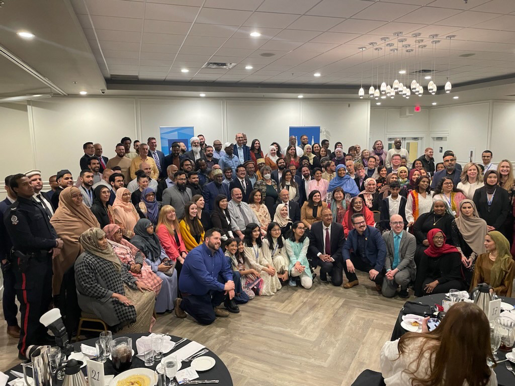 Monday, April 3, 2023 – Senator Paula Simons, third row, centre, joins the City of Edmonton’s first Iftar celebration with Edmonton Mayor Amarjeet Sohi and other members of the community to break the fast.