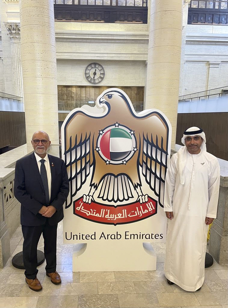 Tuesday, March 28, 2023 – Senator Mohamed-Iqbal Ravalia, left, and Fahad Saeed Mohamed Abdulla Al Raqbani, United Arab Emirates Ambassador to Canada, co-host a Ramadan Iftar in the Senate of Canada Building in Ottawa, Ontario. Over 150 parliamentarians and foreign dignitaries attended this special event where they enjoyed a meal and honoured Muslim communities.