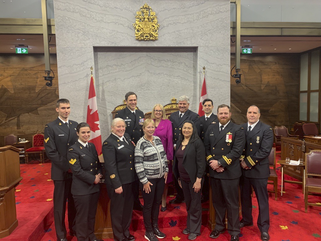 Tuesday, March 28, 2023 – Senator Jane Cordy, second row, second from left, honours nine sailors for exemplary service to the Royal Canadian Navy and the Canadian Coast Guard during a ceremony the senator co-sponsored with the Speaker of the Senate, George F. Furey, in the Senate Chamber. The ceremony took place on Navy and Coast Guard Appreciation Day, a longtime Senate event.