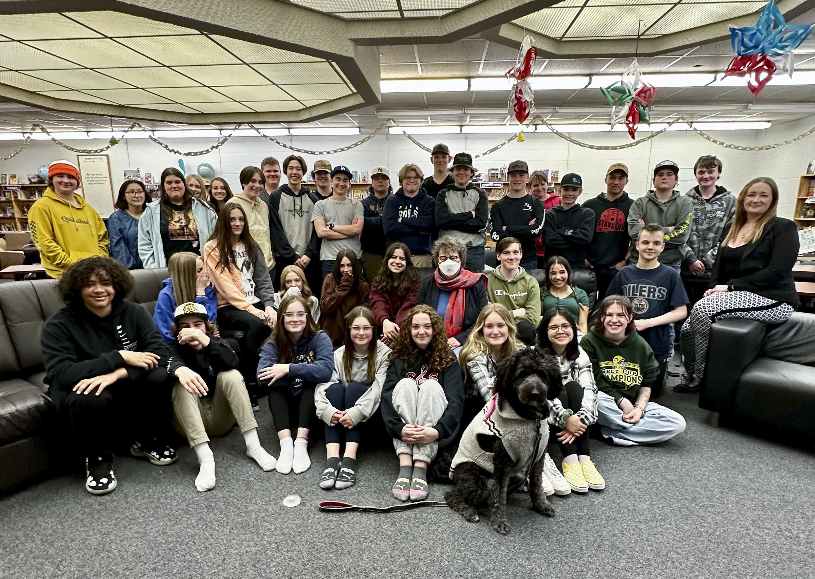 Tuesday, April 4, 2023 – Senator Paula Simons, second row, centre, visits Grade 9 social studies students – and their therapy dog – at Namao School in Sturgeon County, Alberta. During the SENgage event, the senator shared insights about her journey to the Red Chamber and her responsibilities. The students also had the opportunity to ask questions about her work.