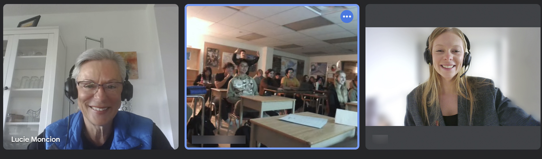 Monday, May 15, 2023 – Senator Lucie Moncion, left, joins virtually a Grade 12 class studying Canadian and international politics at Innisdale Secondary School in Barrie, Ontario. During the session, co-ordinated by SENgage, she discussed her path to the Senate, and her role and responsibilities as a senator. She also engaged students in a discussion about Bill S-201, An Act to amend the Canada Elections Act and the Regulation Adapting the Canada Elections Act for the Purposes of a Referendum (voting age), and participated in a question-and-answer period.