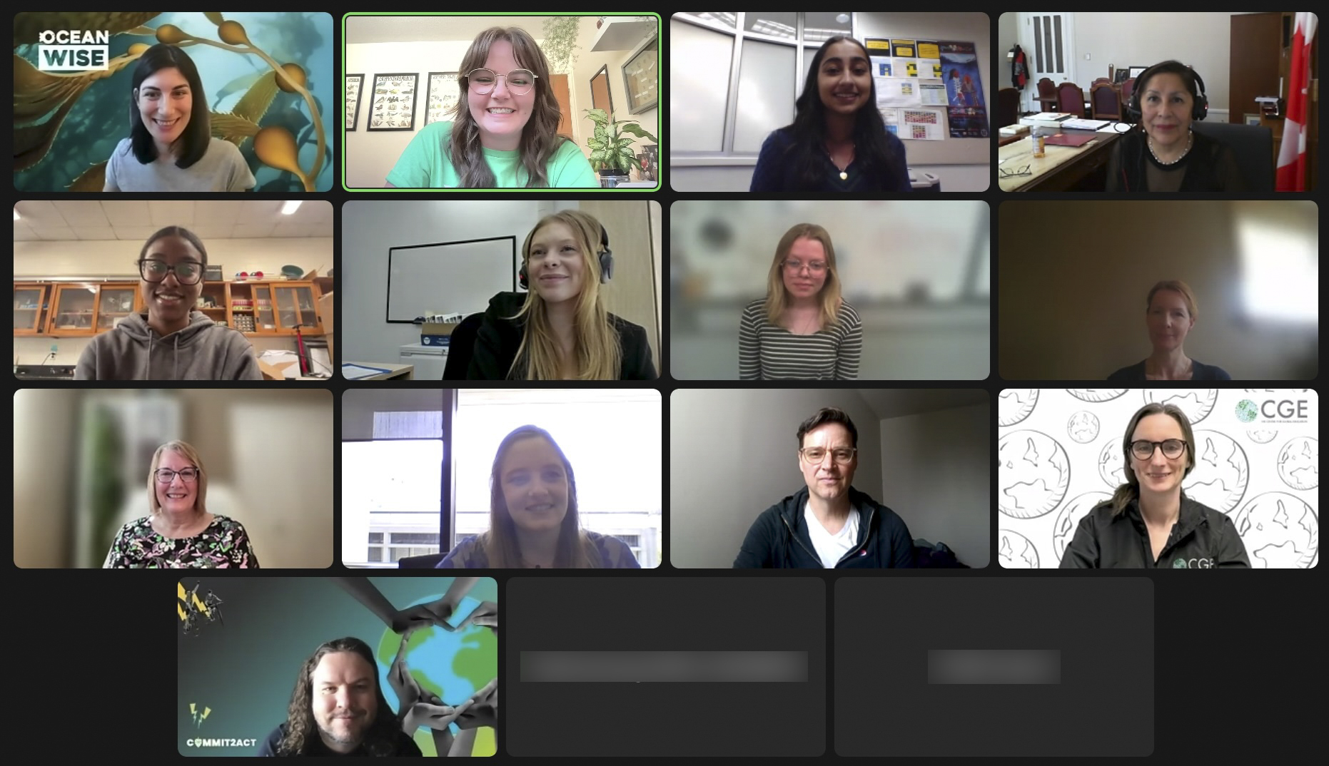 Wednesday, May 10, 2023 – Senator Rosa Galvez, top right, participates in a call for the Waves of Change 2023 Climate Manifesto Presentation hosted by the Centre for Global Education. Three youth co-authors shared their main ideas, and Senator Galvez and the other panellists shared their thoughts and reactions to the presentation, as well as words of encouragement and inspiration.