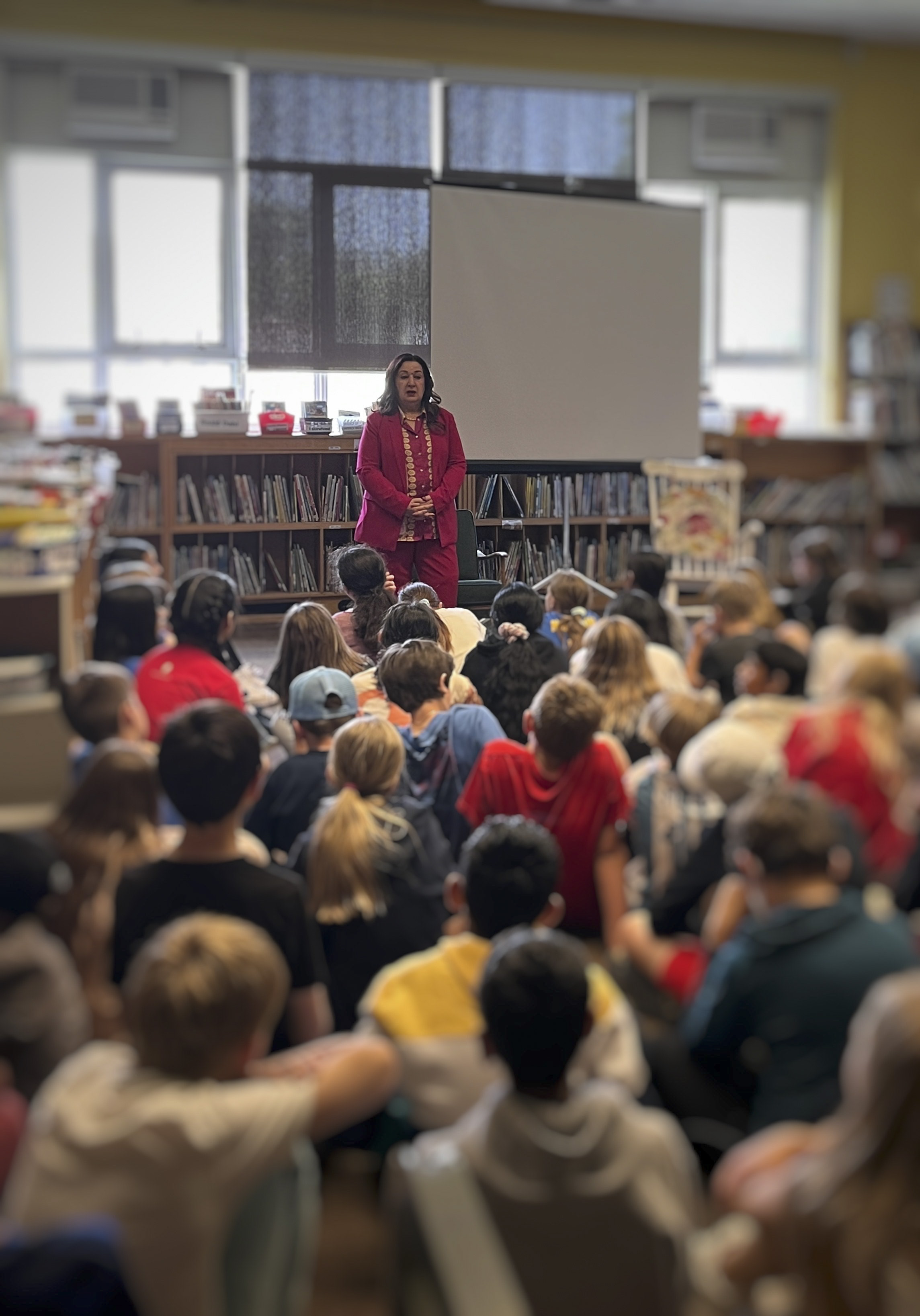 Tuesday, May 23, 2023 – Senator Salma Ataullahjan meets with students at Whitney Junior Public School in Toronto, Ontario, who are learning about the federal government system and how Canada interacts with other countries. In this visit organized by SENgage, she touched on the role of the Senate in Parliament, what senators do and her own interests.