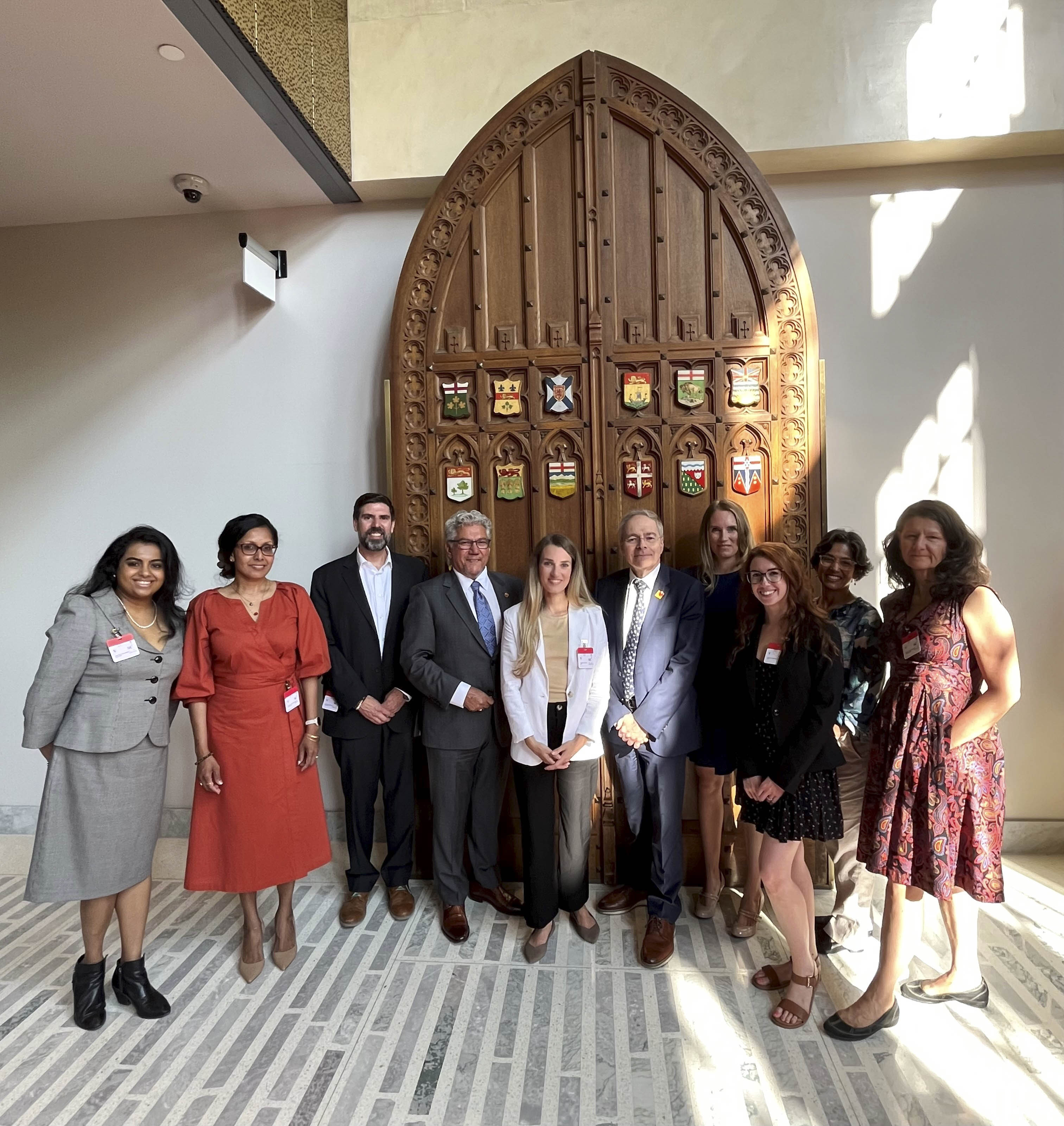 Tuesday, June 13, 2023 – Senator Pierre J. Dalphond, fifth from right, and Senator Marty Klyne, fourth from left, meet with Camille Labchuk, Executive Director of Animal Justice, centre; Kaitlyn Mitchell, a staff lawyer with Animal Justice, fourth from right; Barbara Cartwright, CEO of Humane Canada, right; and additional representatives of Canadian animal welfare organizations in the Senate of Canada Building. They celebrated the adoption of Bill S-5, the Strengthening Environmental Protection for a Healthier Canada Act, and the phasing out of toxicity tests on animals.