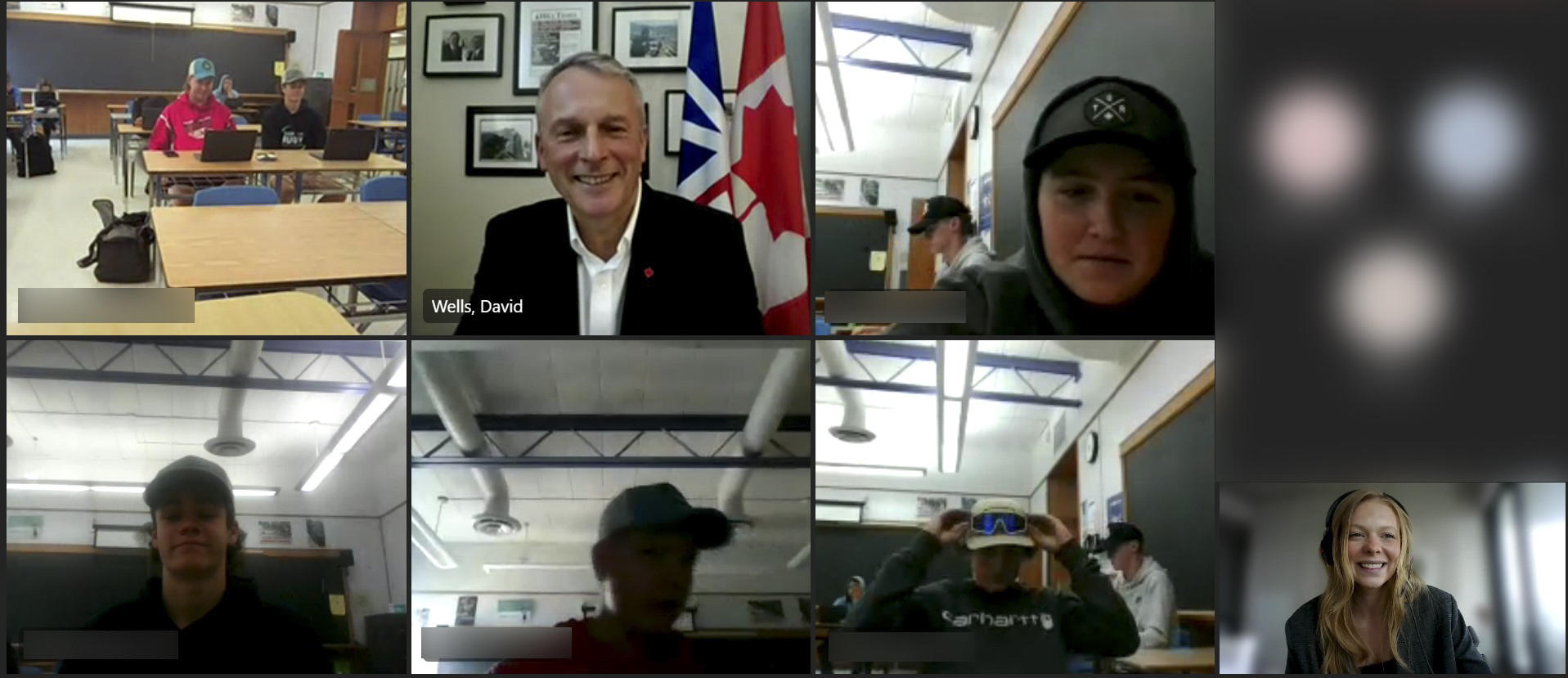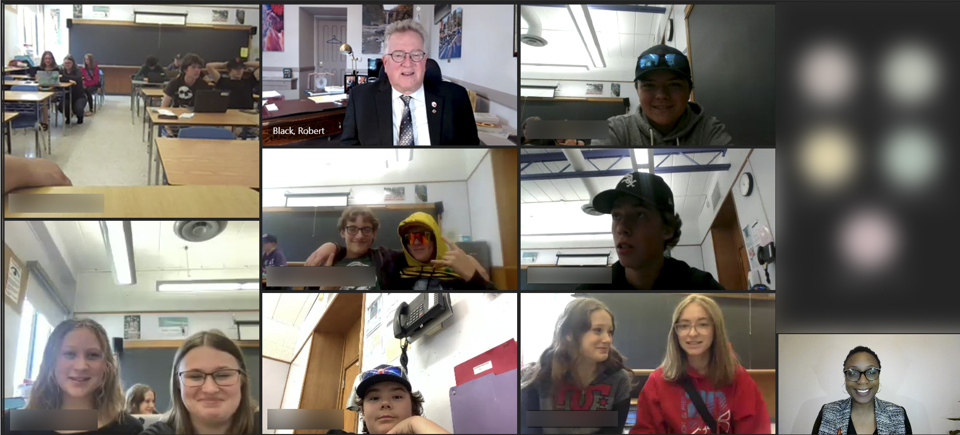 Monday, June 12, 2023 – Senator David M. Wells meets virtually with a Grade 10 civics class at F.E. Madill Secondary School in Wingham, Ontario. During the virtual visit organized by SENgage, he shared his journey to the Senate and what it was like when he got the call that he had been appointed. He shared insights about his role as a senator, his day-to-day work and his hobbies. He also answered questions from the students.