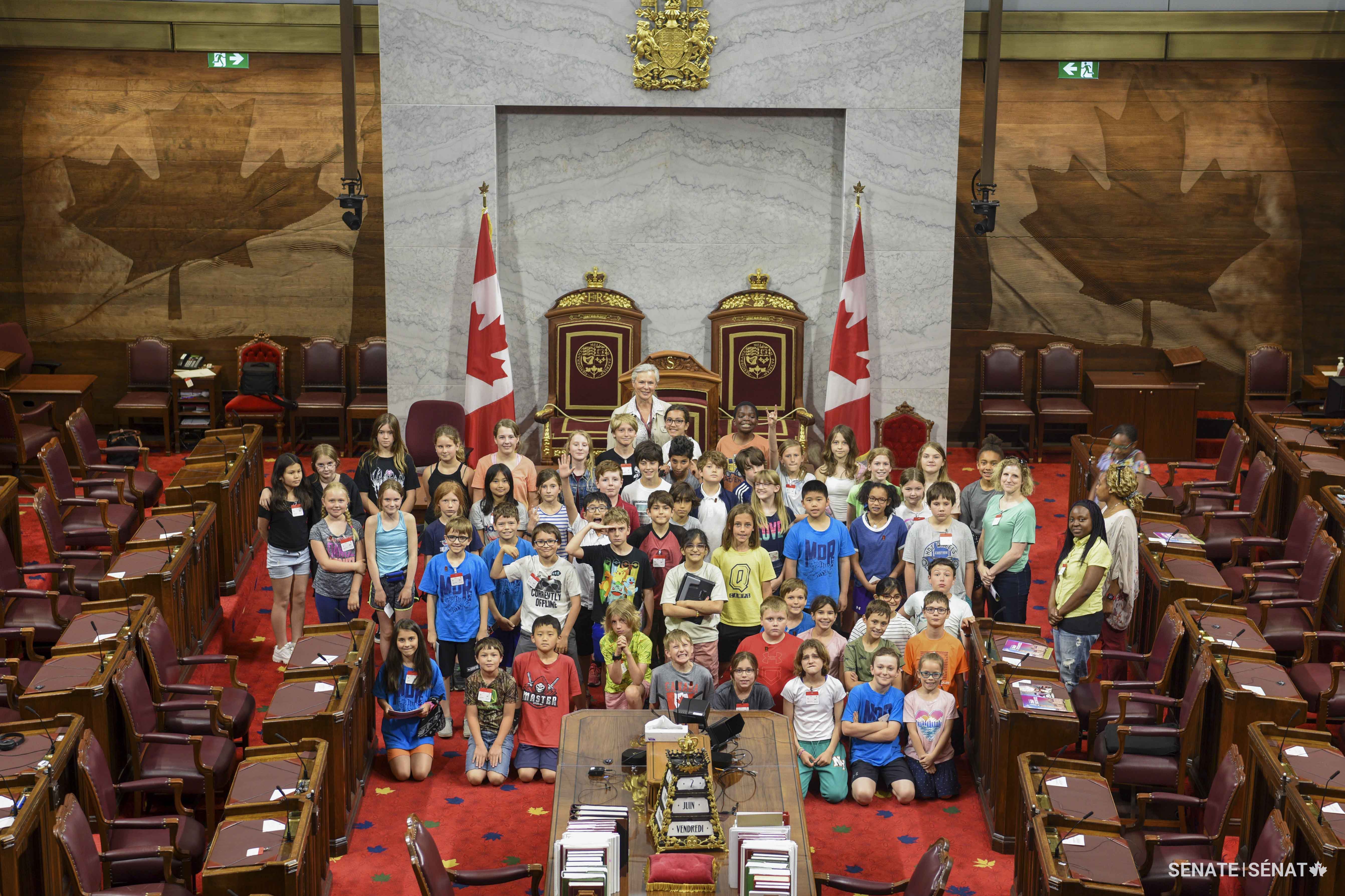 Friday, June 2, 2023 – Senator Lucie Moncion, back row, centre, meets with Grade 4 and Grade 5 students from Madeleine-De-Roybon Public Elementary School who made a special trip from Kingston, Ontario, to the Red Chamber. In the visit organized by SENgage, she taught the class about the Senate’s role in Parliament, how bills get passed and her work as a senator. She also devoted time to answering questions from the students.