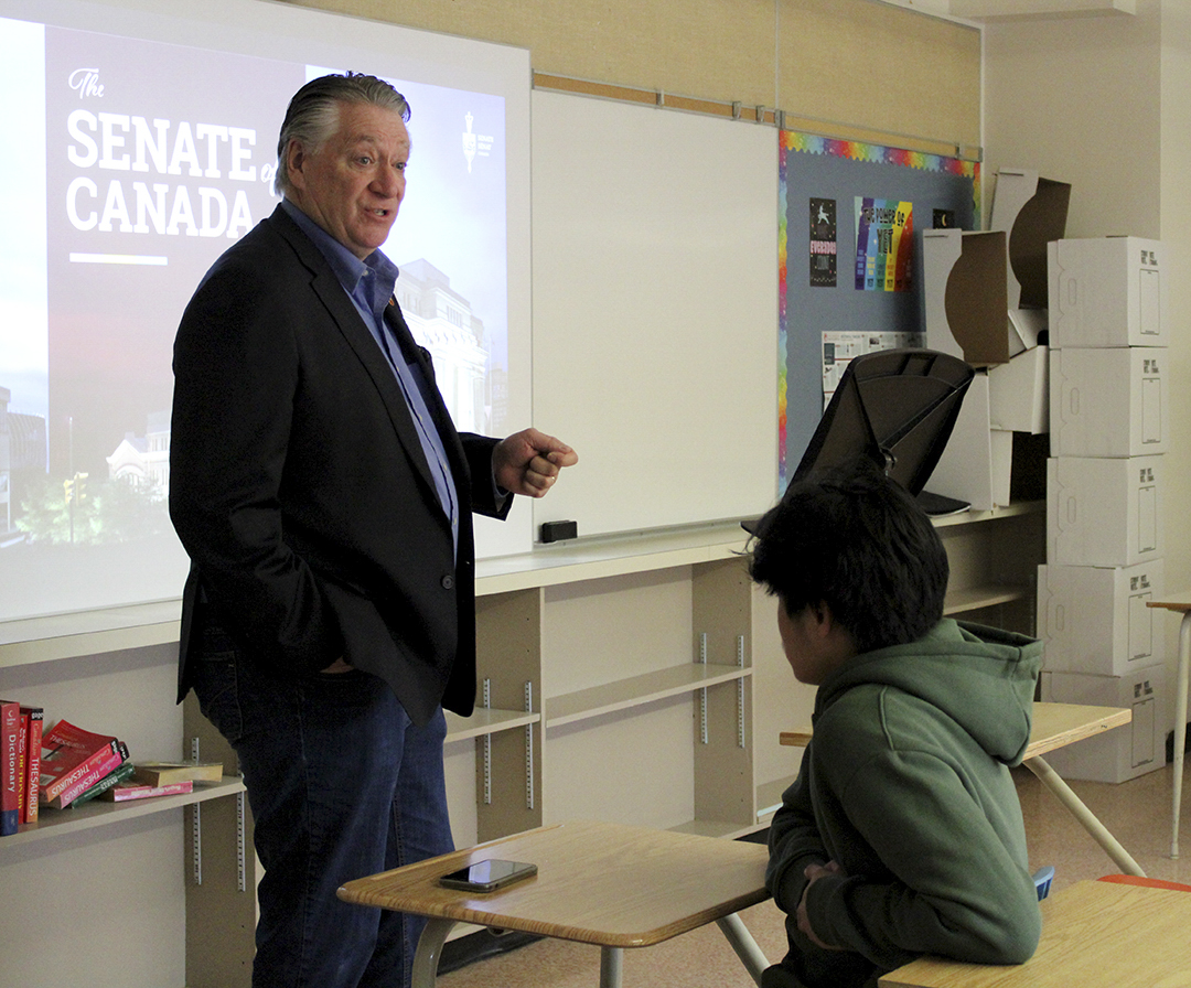 Wednesday, May 24, 2023 – Senator Scott Tannas meets with Grade 11 social studies students at J.T Foster High School in Nanton, Alberta. During the session organized by SENgage, he explained to the class the role of the Senate within Parliament, described his role and responsibilities as a senator and shared some of his personal interests. The session also included a question-and-answer period during which students had the opportunity to engage with Senator Tannas. (Photo credit: Nanton News).