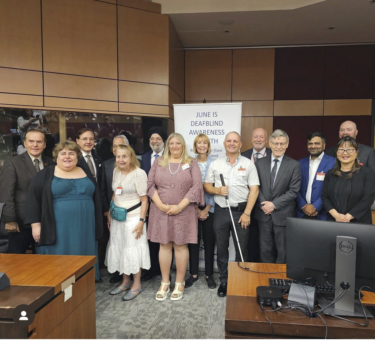Wednesday, June 7, 2023 – Senator Sabi Marwah, back row, fourth from left, hosts a reception in recognition of Deafblind Awareness Month in the Senate of Canada Building. The event was supported by Senator Yonah Martin, front row, right, the original co-sponsor for the motion recognizing June as Deafblind Awareness Month in 2015. Guests included members of the deafblind community, as well as senators Percy Mockler, Tony Loffreda, Brent Cotter, Elizabeth Marshall, and former senator Vim Kochhar.