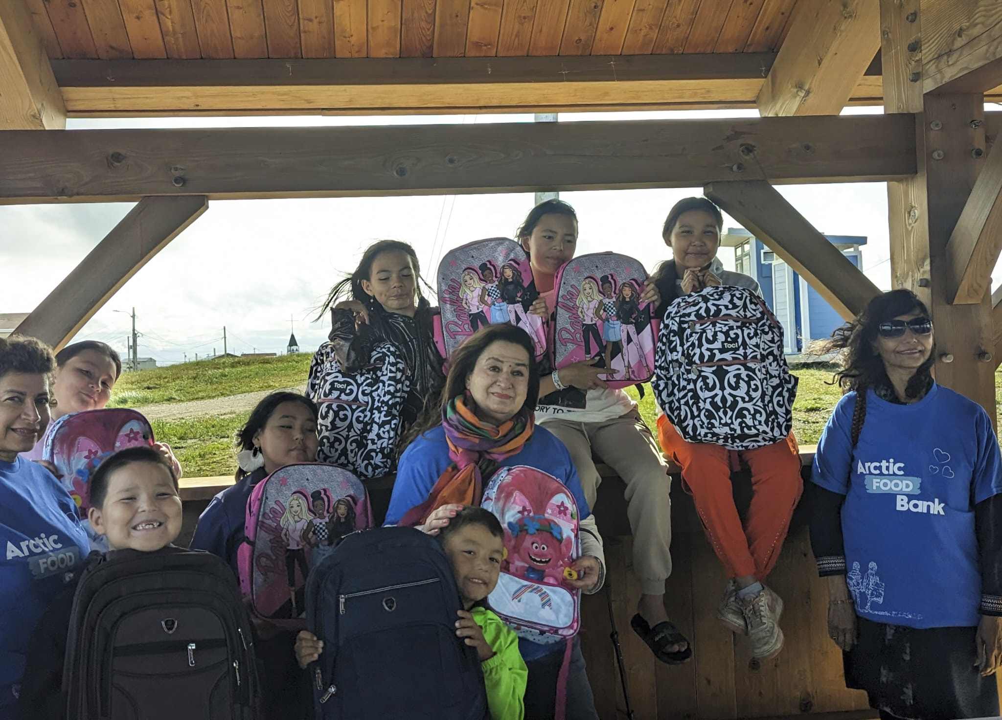 Thursday, August 3, 2023 – Senator Salma Ataullahjan, centre, surrounded by children who just received backpacks filled with supplies; participation in the “Fill-A-Backpack” event organized by the Arctic Food Bank and Muslim Welfare Center; Tuktoyaktuk, Northwest Territories.