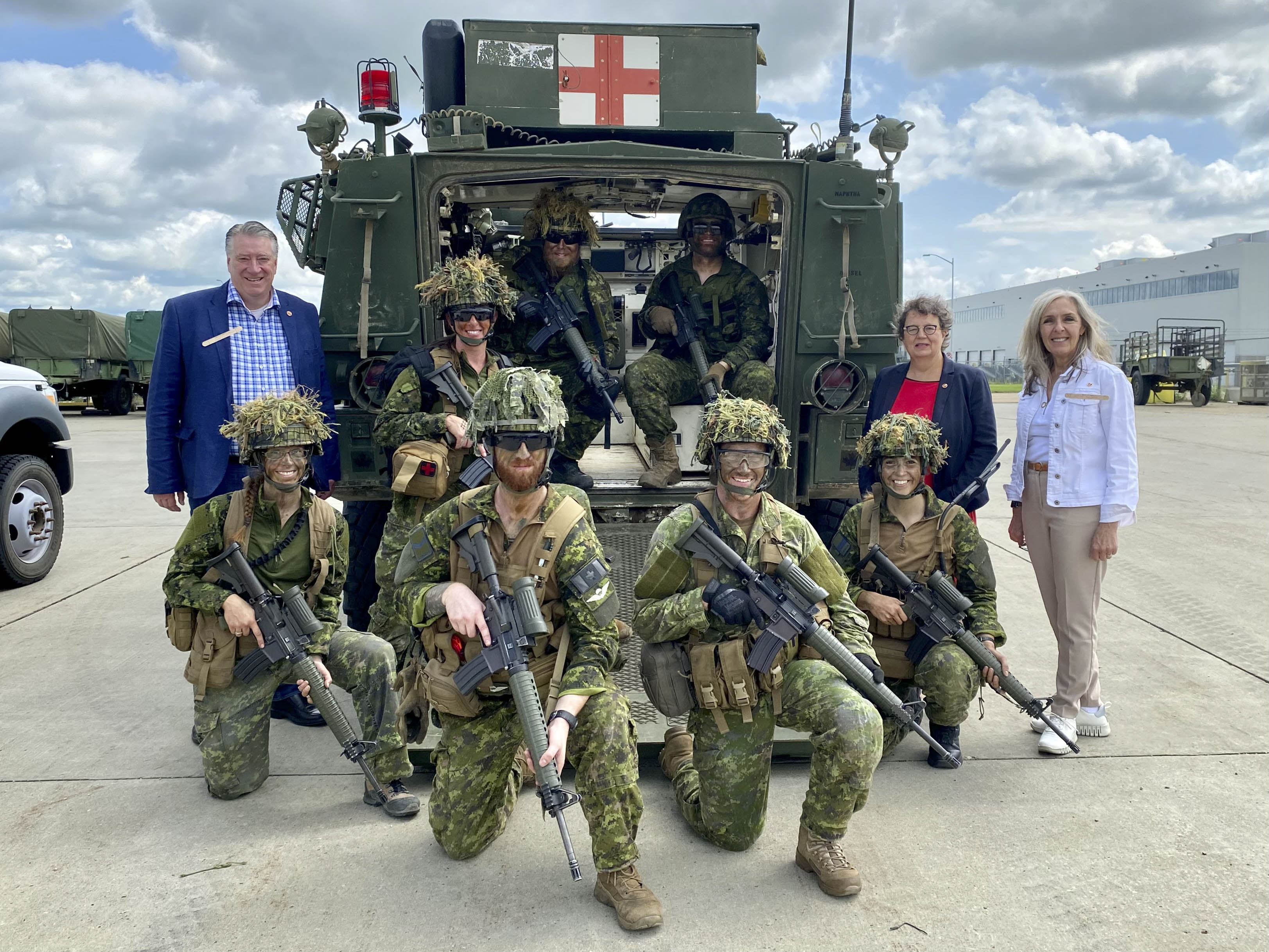Saturday, July 29, 2023 – Senators Rebecca Patterson, right, Paula Simons, third from right, and Scott Tannas, left; 1 Field Ambulance 125th anniversary celebration; Edmonton, Alberta.
