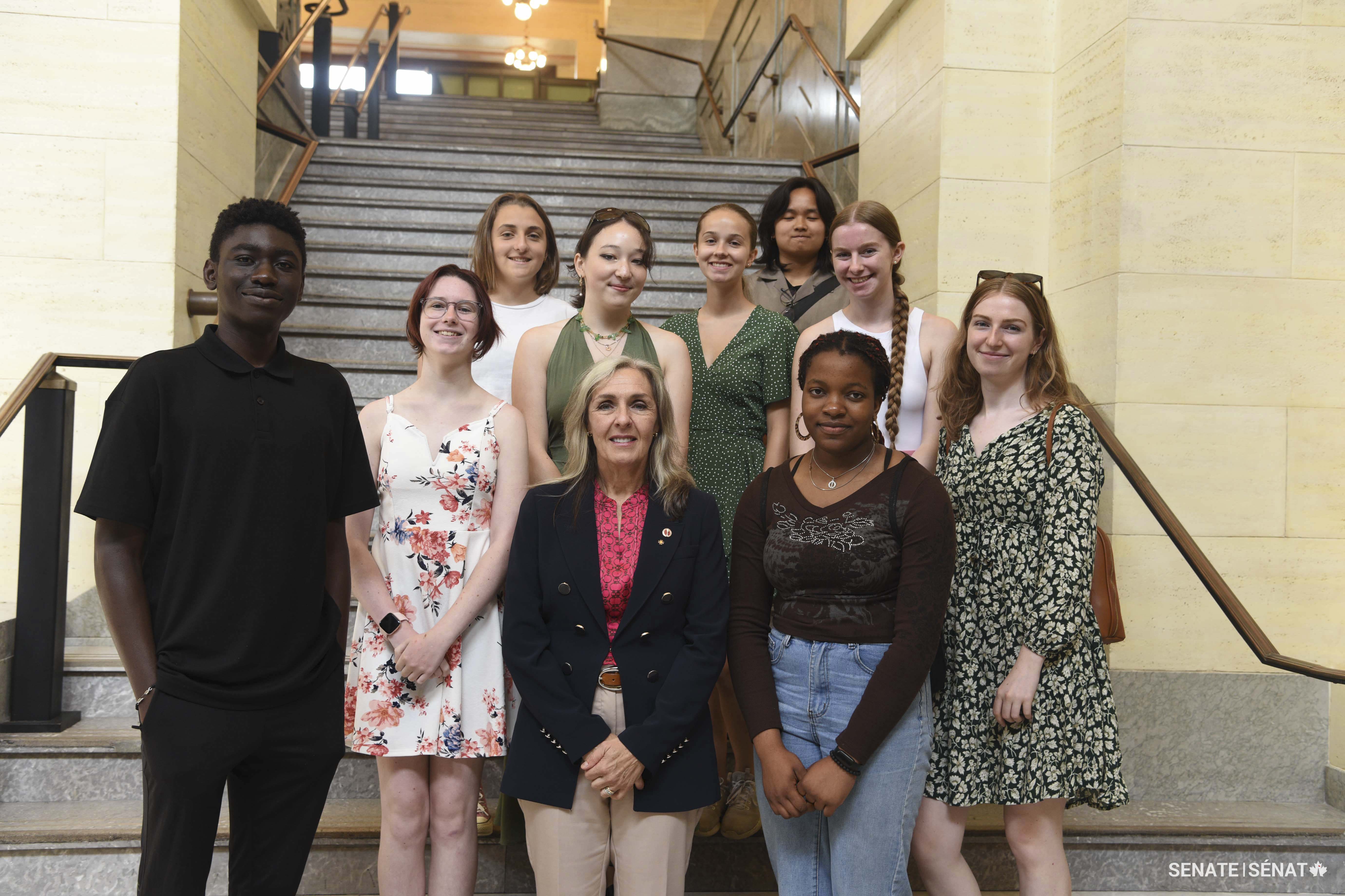Friday, July 14, 2023 – Senator Julie Miville-Dechêne and Senator Marie-Françoise Mégie, front row, second and third from the left, respectively; summer program visit with high school students organized by SENgage; Cap campus at the University of Montréal; Montréal, Quebec.