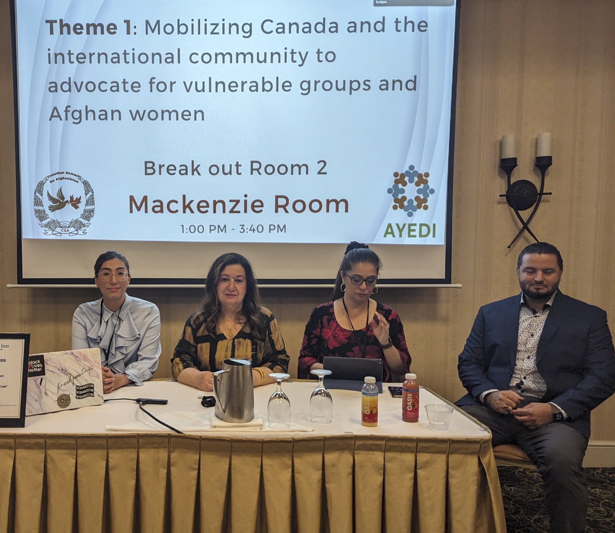 Sunday, August 13, 2023 – Senator Salma Ataullahjan, second from left; participation in a panel titled “Mobilizing Canada and the international community to advocate for vulnerable groups and Afghan women” organized by the Afghan Youth Engagement and Development Initiative; Vaughan, Ontario.