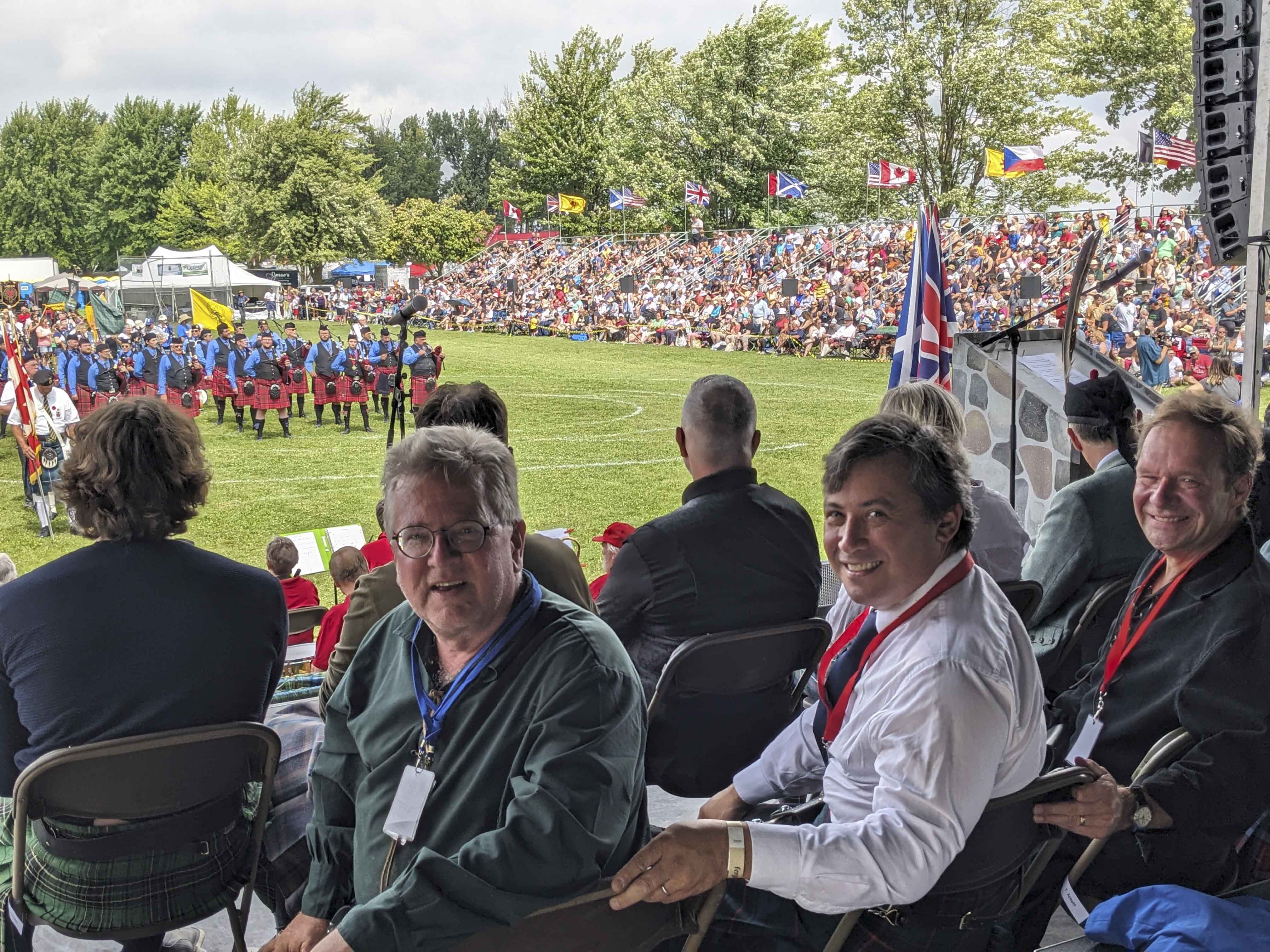 Saturday, August 12, 2023 – From the left, Senator Rob Black, Member of Parliament Michael Chong and Speaker of the Ontario Legislature Ted Arnott; Opening of the 79th Fergus Scottish Festival and Highland Games; Fergus, Ontario.