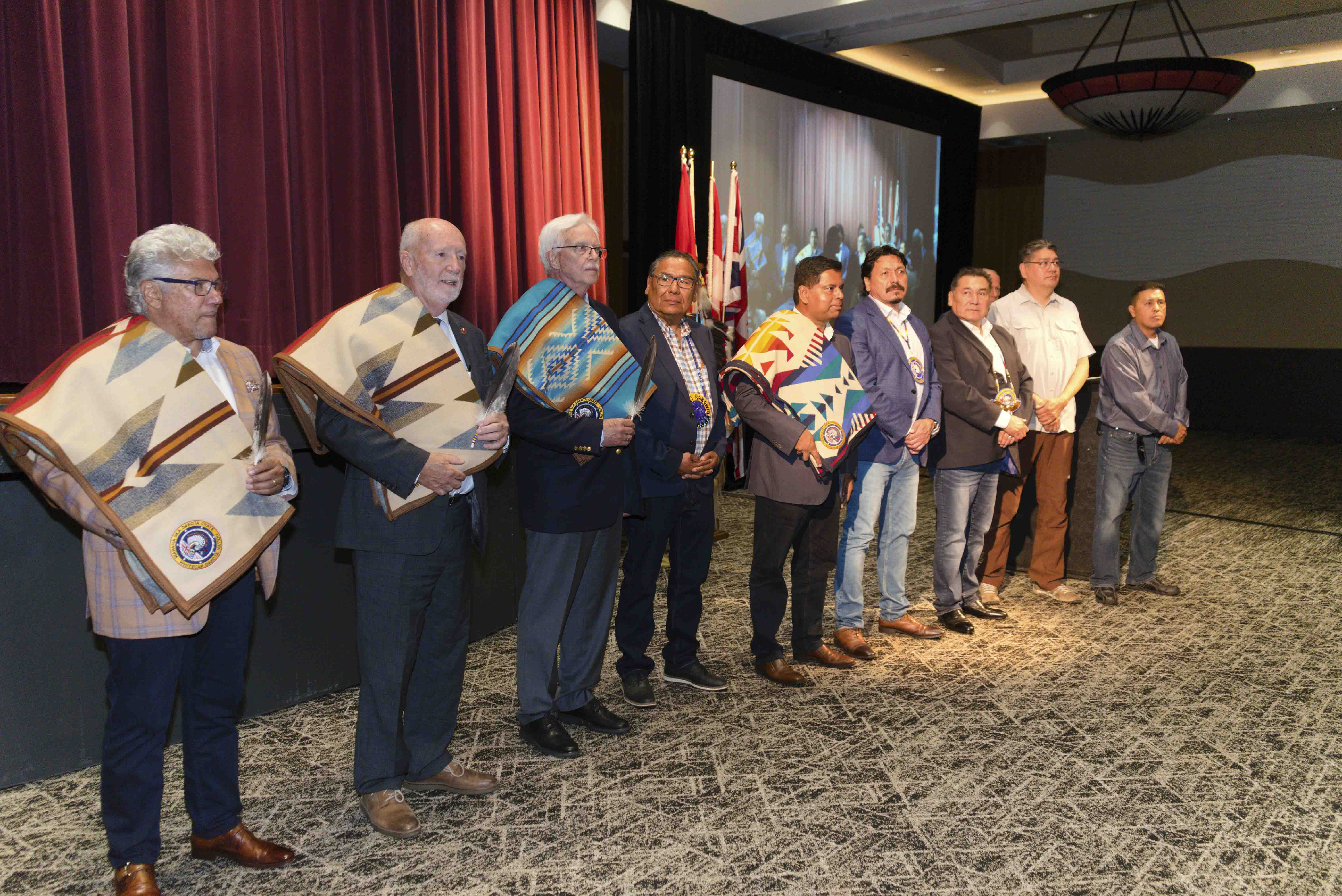 Monday, July 31, 2023 – From the left, senators Marty Klyne, Brent Cotter and David M. Arnot; ceremony to celebrate the Self-Government Treaty Recognizing the Whitecap Dakota Nation / Wapaha Ska Dakota Oyate Act; Whitecap Dakota First Nation; Dakota, Saskatchewan.
