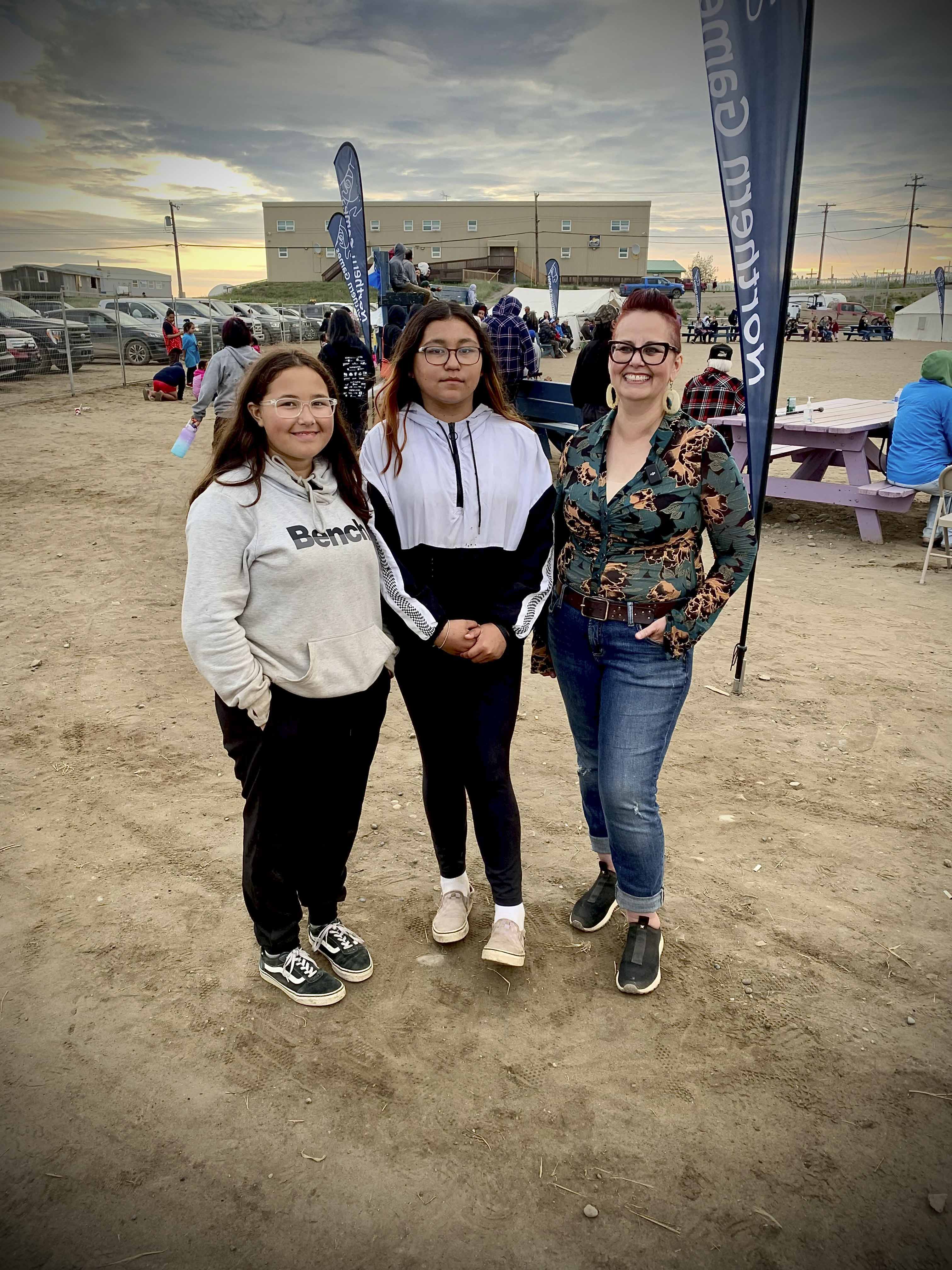 Saturday, July 22, 2023 – Senator Margaret Dawn Anderson, right, with Ava Cardinal and Calle Gruben from the Inuvialuit Communications Society; Inuvialuit Piuyausiat youth games; Tuktuuyaqtuuq, Northwest Territories.