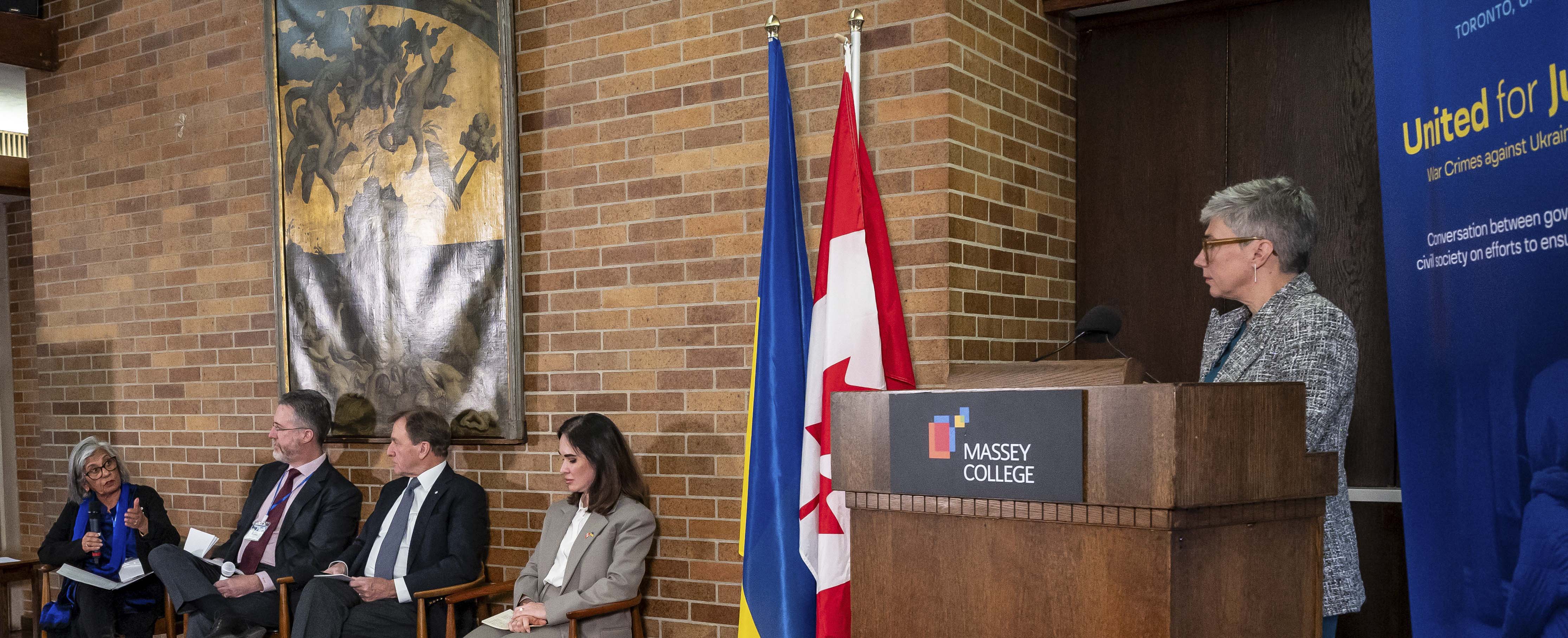 Monday, November 20, 2023 – Senator Ratna Omidvar, far left; United for Justice Conference on War Crimes Against Ukrainian Children, with the senator speaking on the panel examining the forfeiting of Russia’s assets through an international compensation mechanism; Massey College, Toronto, Ontario.