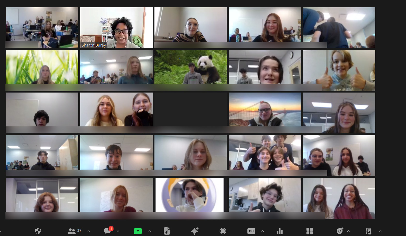 Thursday, November 16, 2023 – Senator Sharon Burey, second top left corner; virtual meeting, organized by SENgage, with students at David Thompson High School, Leslieville, Alberta.
