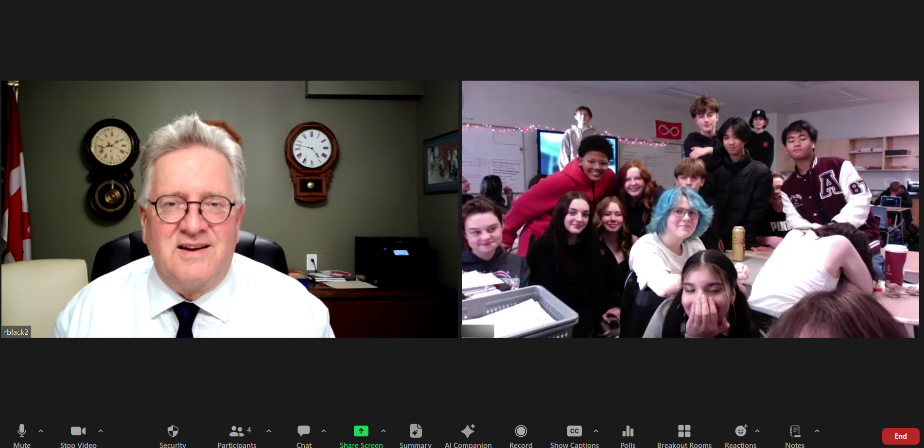 Monday, November 20, 2023 – Senator Robert Black; virtual meeting, coordinated by SENgage, with students from Holy Trinity Catholic School, Fort McMurray, Alberta.