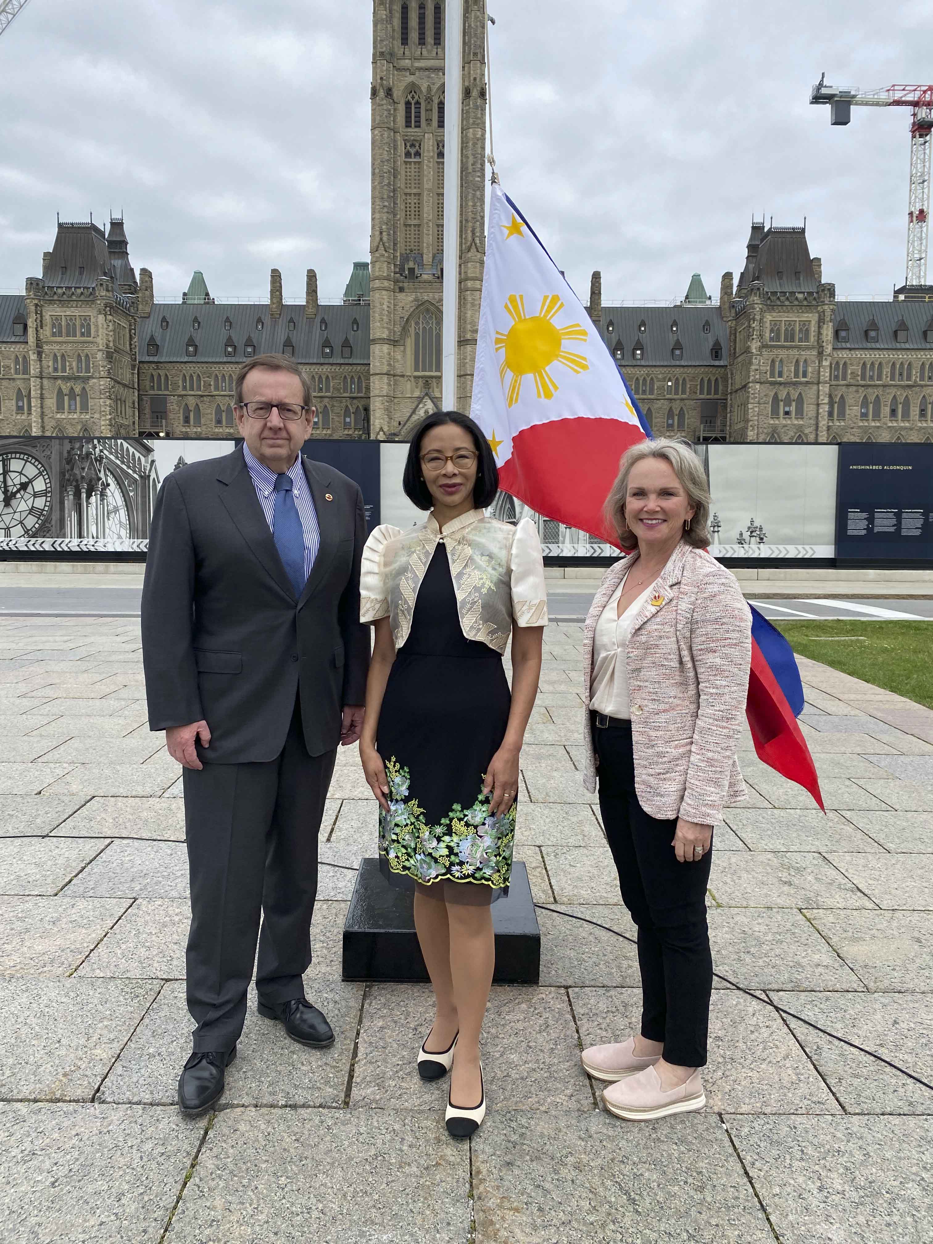 Wednesday, June 12, 2024 – From left to right, senators Percy E. Downe, Flordeliz (Gigi) Osler and Mary Robinson; flag raising for the 126th Anniversary of Philippine Independence; Parliament Hill, Ottawa, Ontario.