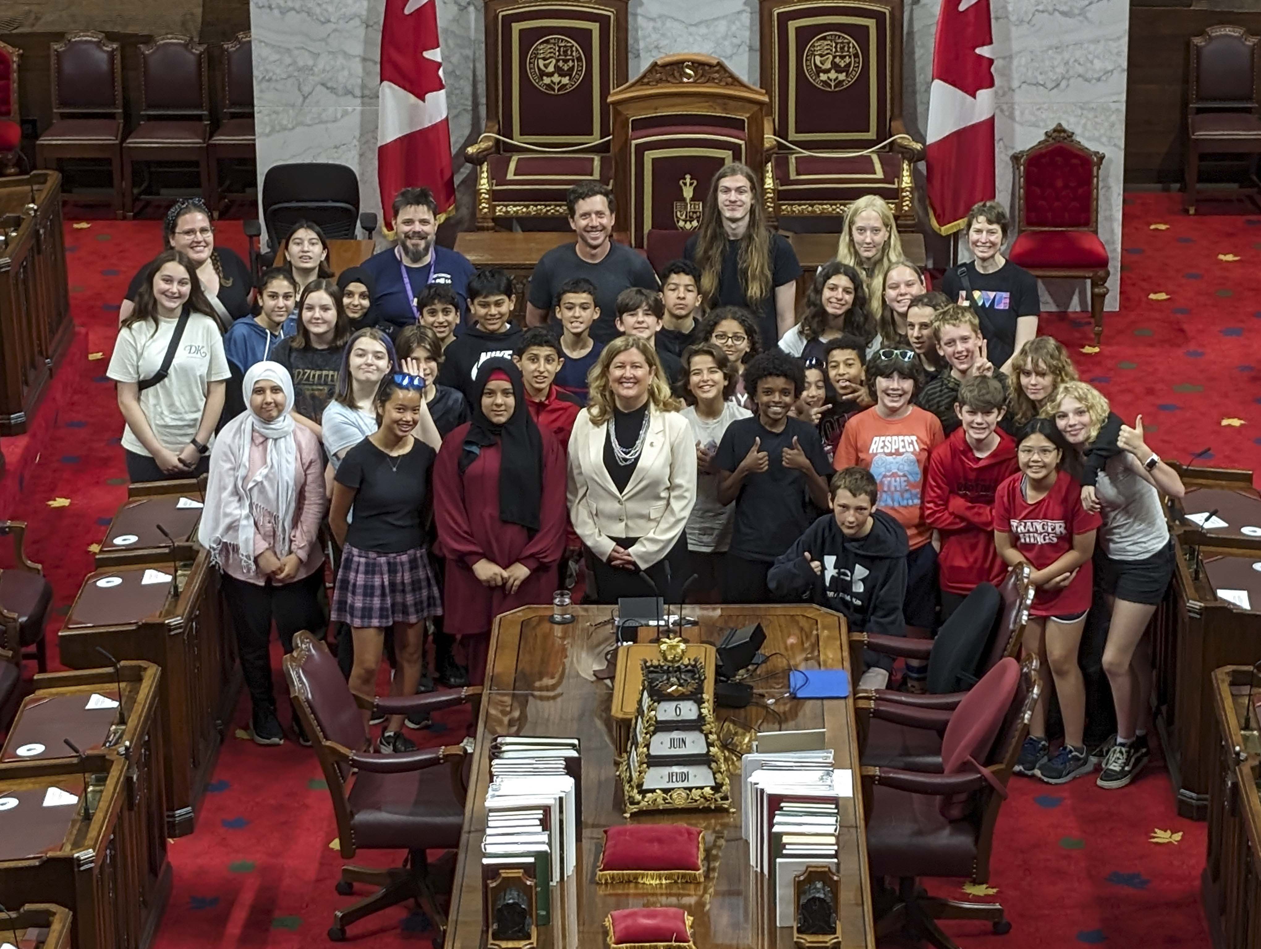 Thursday, June 6, 2024 – Senator Krista Ross, centre, and students from D. Roy Kennedy Public School; meeting, coordinated by SENgage, in the Red Chamber; Senate of Canada Building, Ottawa, Ontario.
