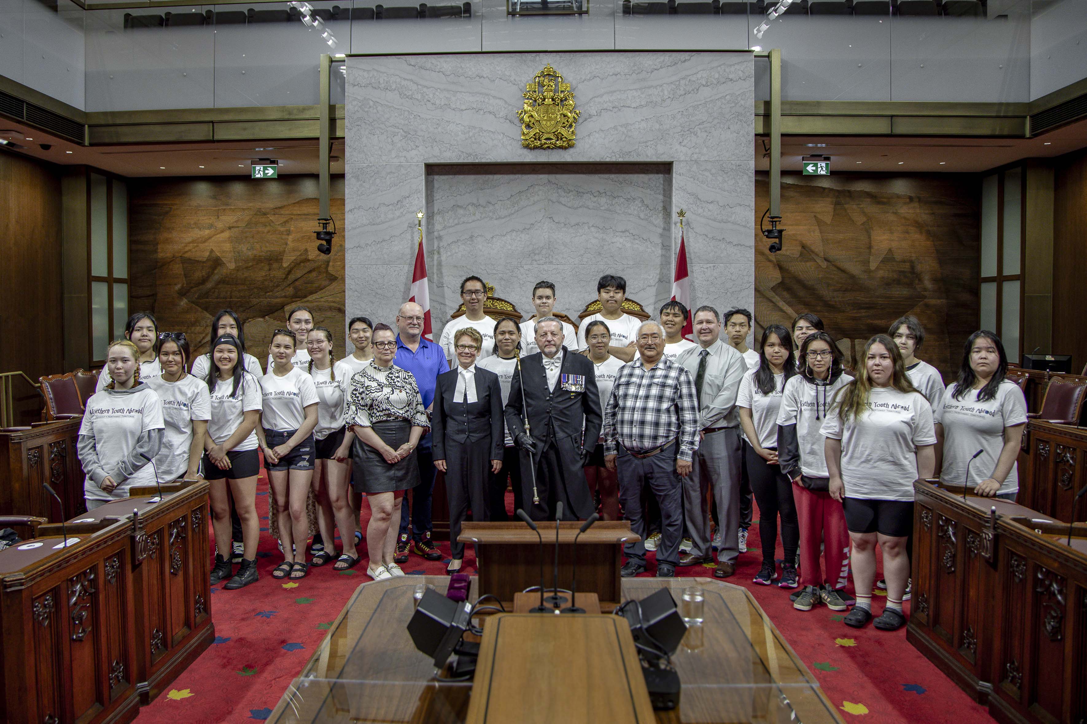 Tuesday, June 18, 2024 – First row, left to right, Senator Dawn Anderson, Speaker of the Senate Raymonde Gagné, Usher of the Black Rod J. Greg Peters, and Speaker of the Legislative Assembly of Nunavut Tony Akoak. Second row, left, Speaker of the Legislative Assembly of the Northwest Territories Shane Thompson, and second row, right, Vice-President of the Legislative Assembly of Nunavut George Hickes, surrounded by participants of the Northern Youth Abroad program; Senate Chamber, Ottawa, Ontario.