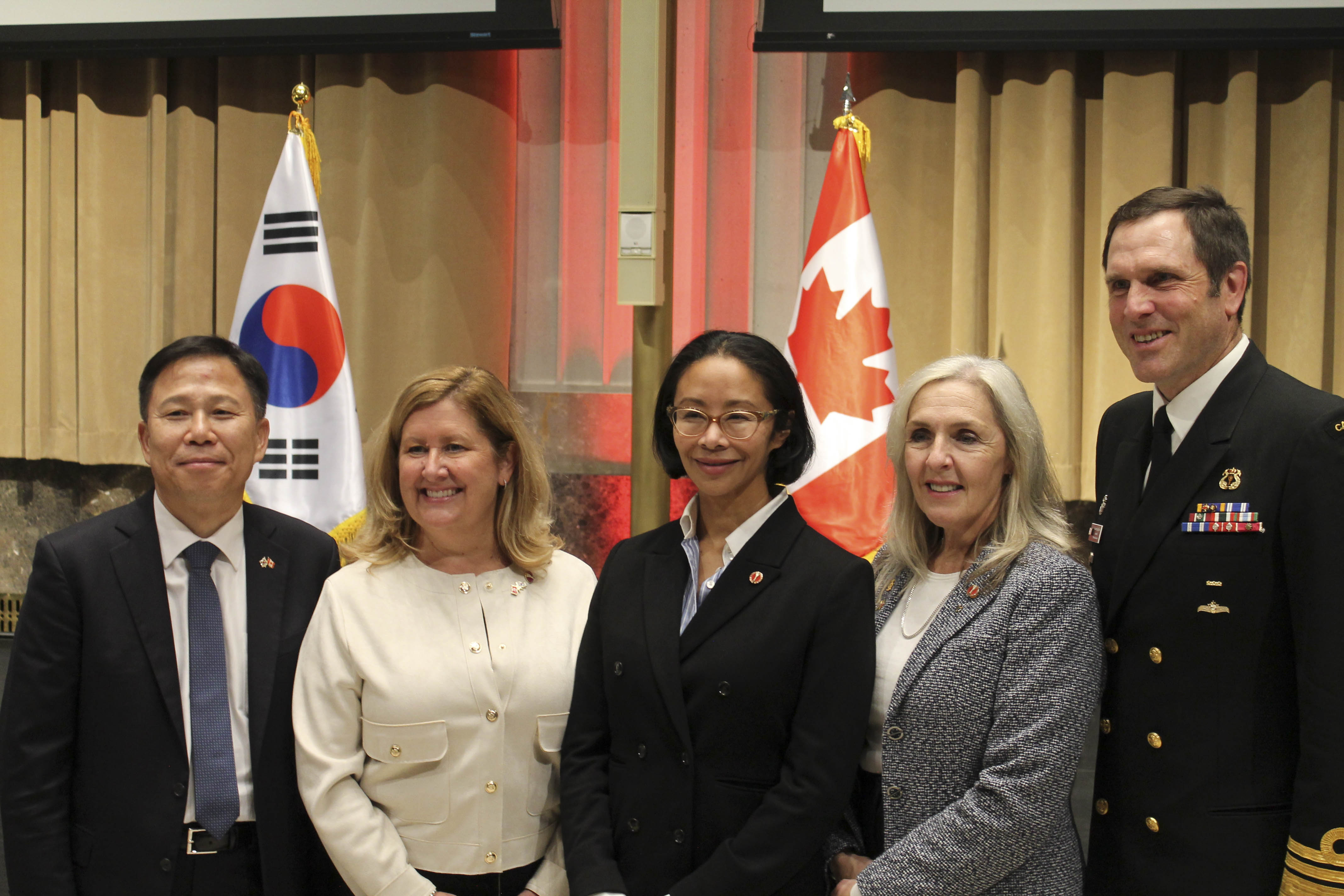 Monday, October 7, 2024 – Senators Krista Ross, second from left, Flordeliz (Gigi) Osler, centre, and Rebecca Patterson, second from right, with Korean Ambassador to Canada, H.E. Woongsoon Lim, and Commander of the Royal Canadian Navy, Vice-Admiral Angus Topshee; Korean National Day on the Hill; Sir John A. Macdonald Building, Ottawa, Ontario.
