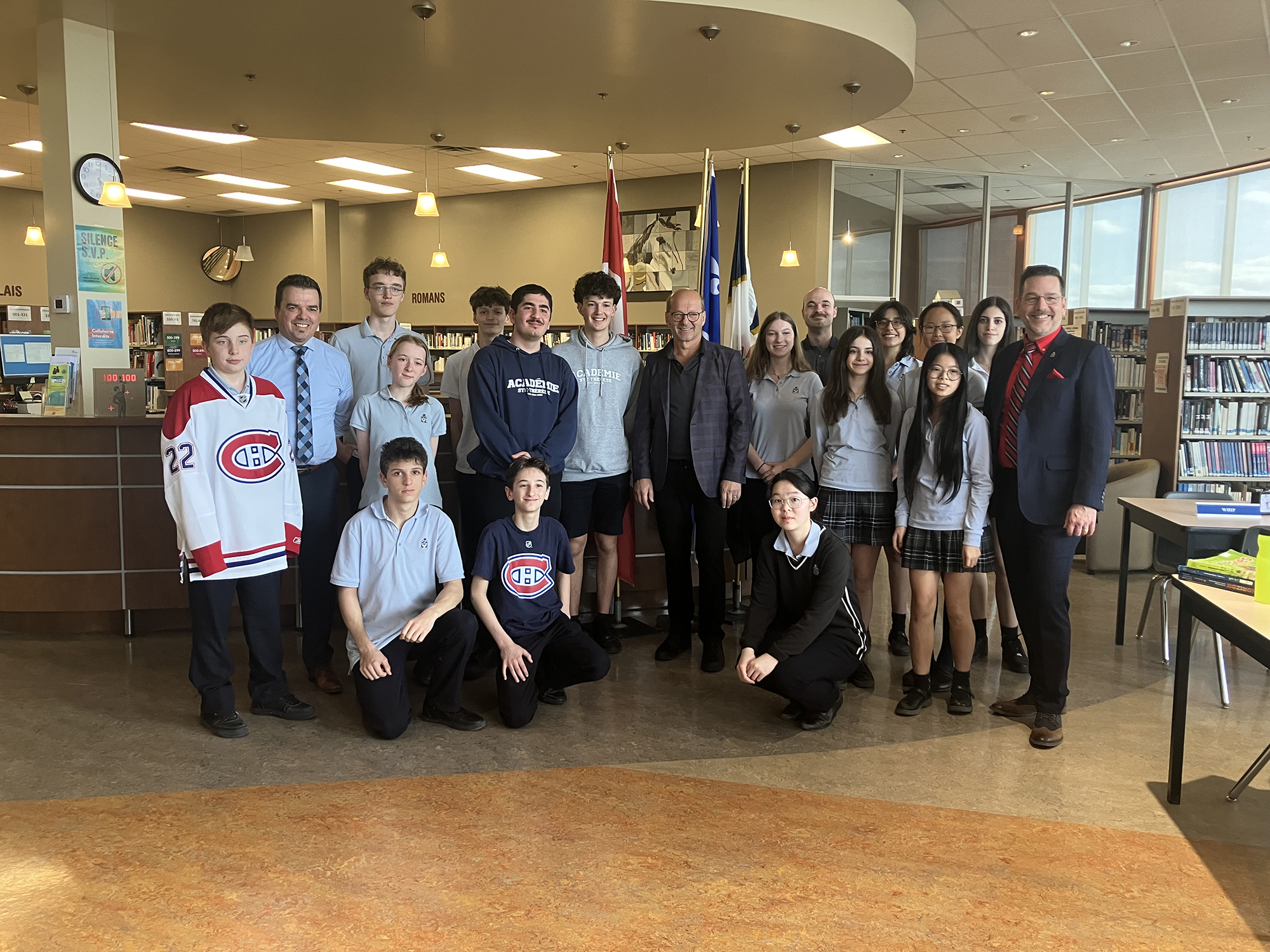 Wednesday, April 23, 2025 – Senator Claude Carignan, centre; visit with students organized by SENgage; Académie Ste-Thérèse, Sainte-Thérèse, Quebec.