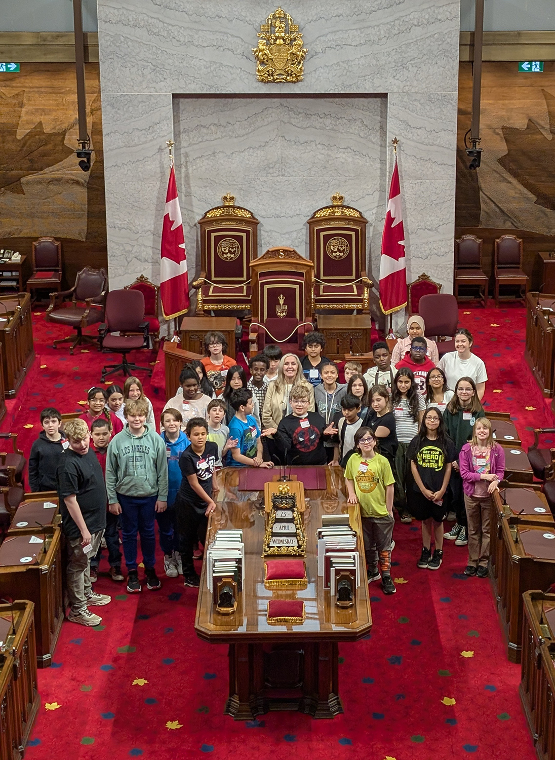Wednesday, April 23, 2025 – Senator Rebecca Patterson, centre; tour of the Senate Chamber with students from D. Roy Kennedy Public School, organized by SENgage; Senate of Canada Building, Ottawa, Ontario.