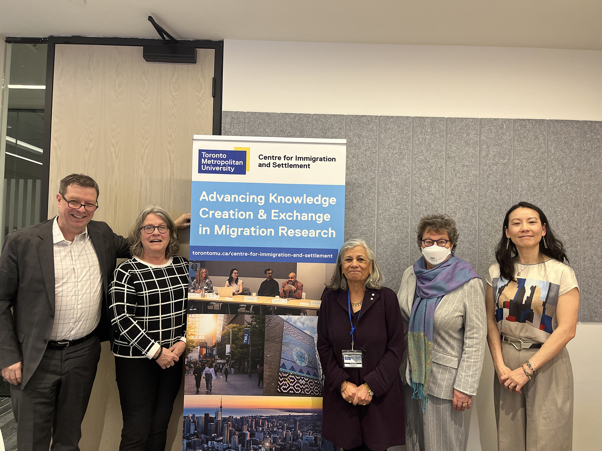 Wednesday, April 2, 2025 – Senator Paula Simons, second from right, with former senator Ratna Omidvar, third from right, Doug Saunders, Globe and Mail, left, Mary Row, Canadian Urban Institute, second from left, and Dr. Zhixi Zhuang, TMU, right; event hosted by Toronto Metropolitan University’s Centre for Immigration and Settlement; Toronto, Ontario.