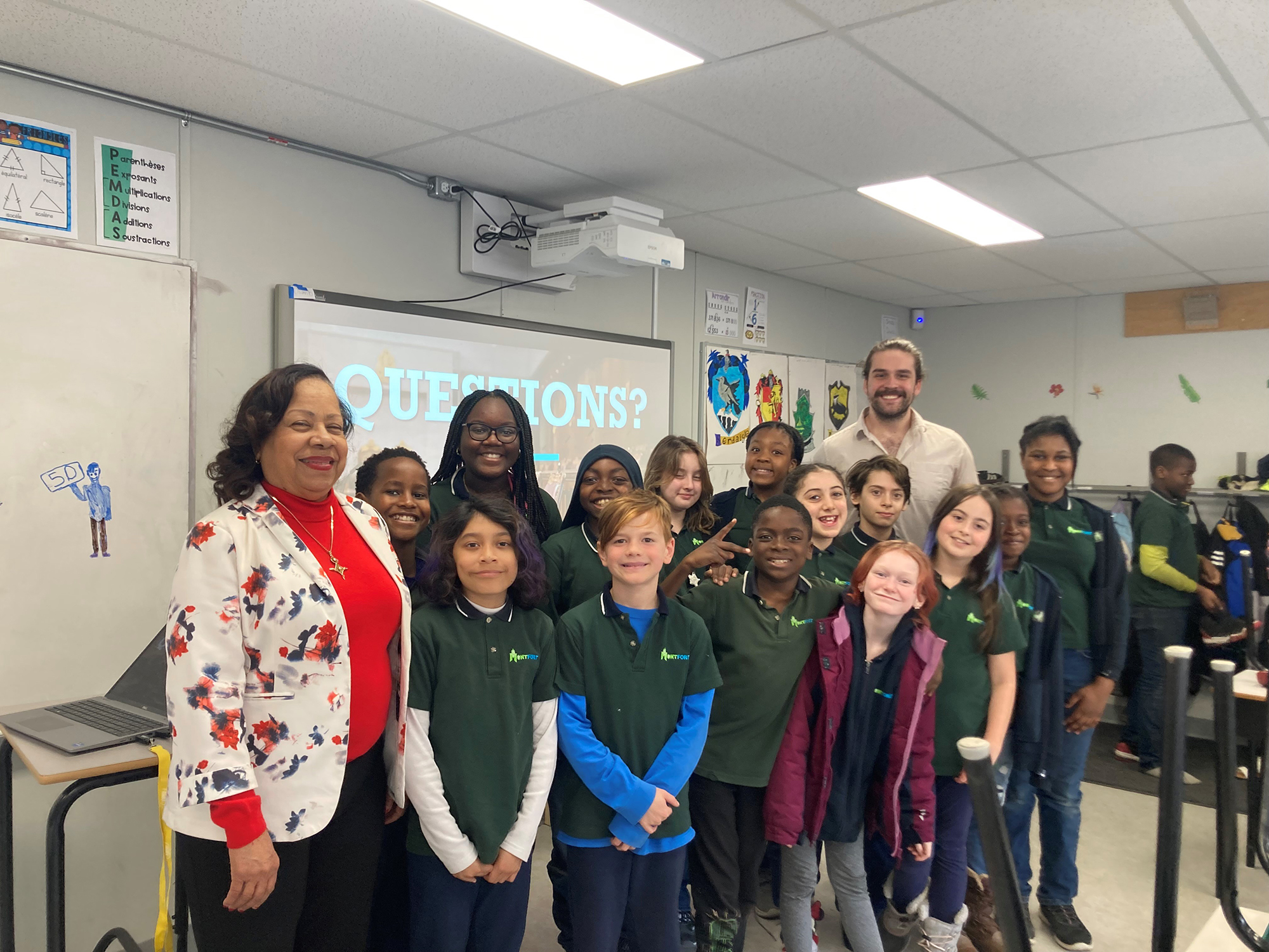 Friday, April 11, 2025 – Senator Marie-Françoise Mégie, left; visit with Grade 5 students, coordinated by SENgage; École élémentaire catholique Montfort, Ottawa, Ontario.