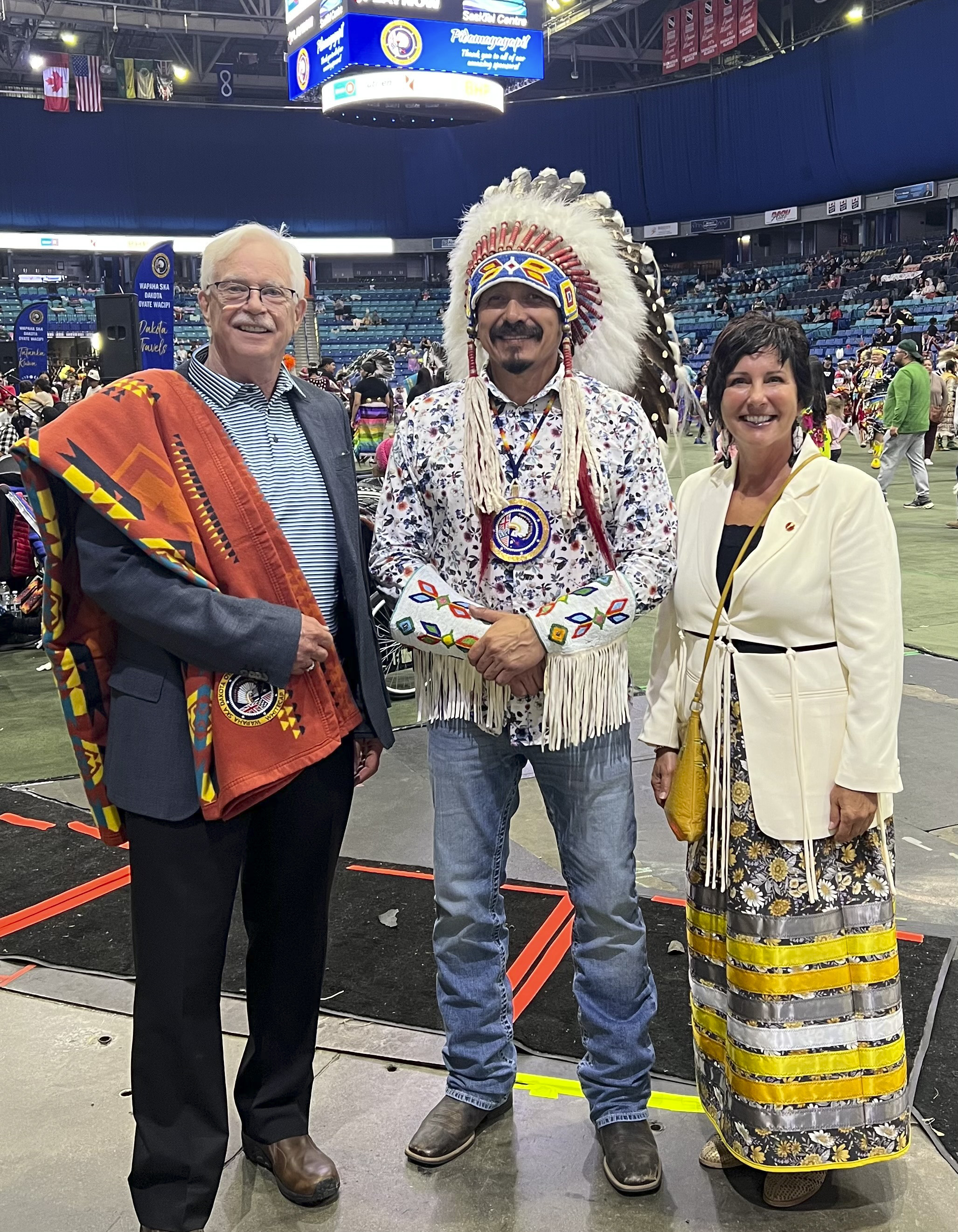 Wednesday, August 27, 2025 – Senators David M. Arnot, left, Tracy Muggli, right; second annual Wapaha Ska Dakota Oyate Wacipi – Whitecap Dakota Nation Competition Powwow; SaskTel Centre, Saskatoon, Saskatchewan.